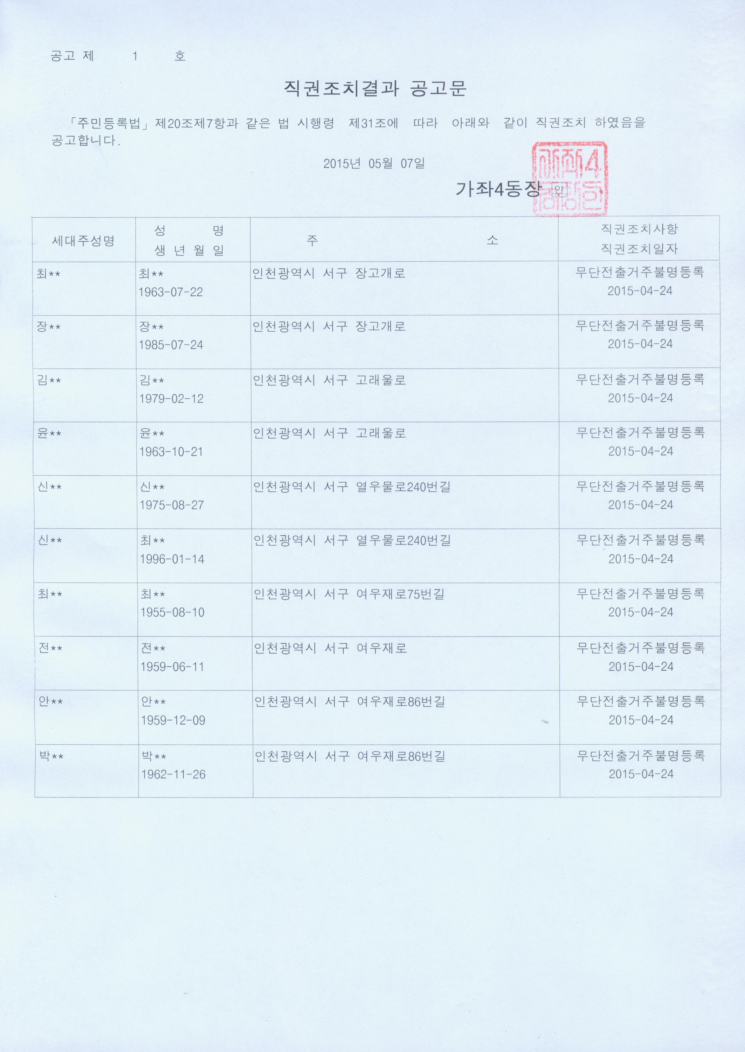 주민등록법 제20조제7항의 규정에 의거 직권조치 사실을 통지하였으나 주소불명, 수취인 미거주 등의 사유로 반송되어, 같은 법 시행령 제31조 규정에 의거 직권조치 사실을 붙임과 같이 공고합니다.