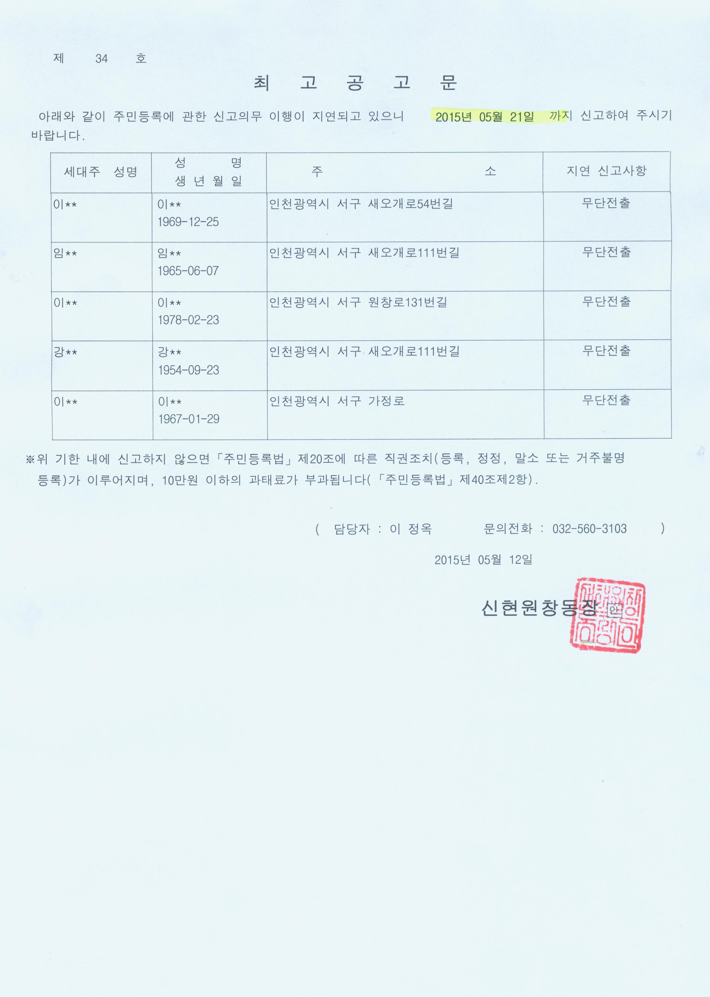 주민등록 무단전출로 판단되는 자에 대하여 최고장을 발송하였으나 기한 내 신고하지 않아 주민등록법 제20조 및 제3항, 동법 시행령 제28조에 의거하여 아래와 같이 공고(최고공고)합니다. |