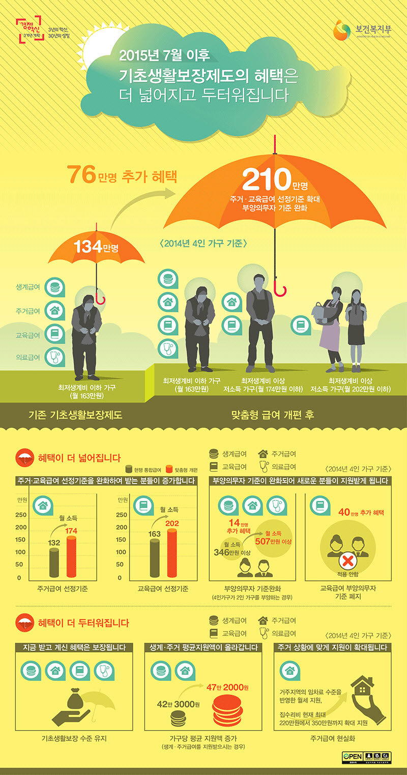 생활이 어려워지는 위기가 닥쳤을 때 국민 누구에게나 최저생활을 보장해드리고, 다시 일어서실 수 있도록 돕기 위해 2000년부터 시행한 기초생활보장제도가 2015년 7월, 14년 만에 새롭게 바뀝니다.