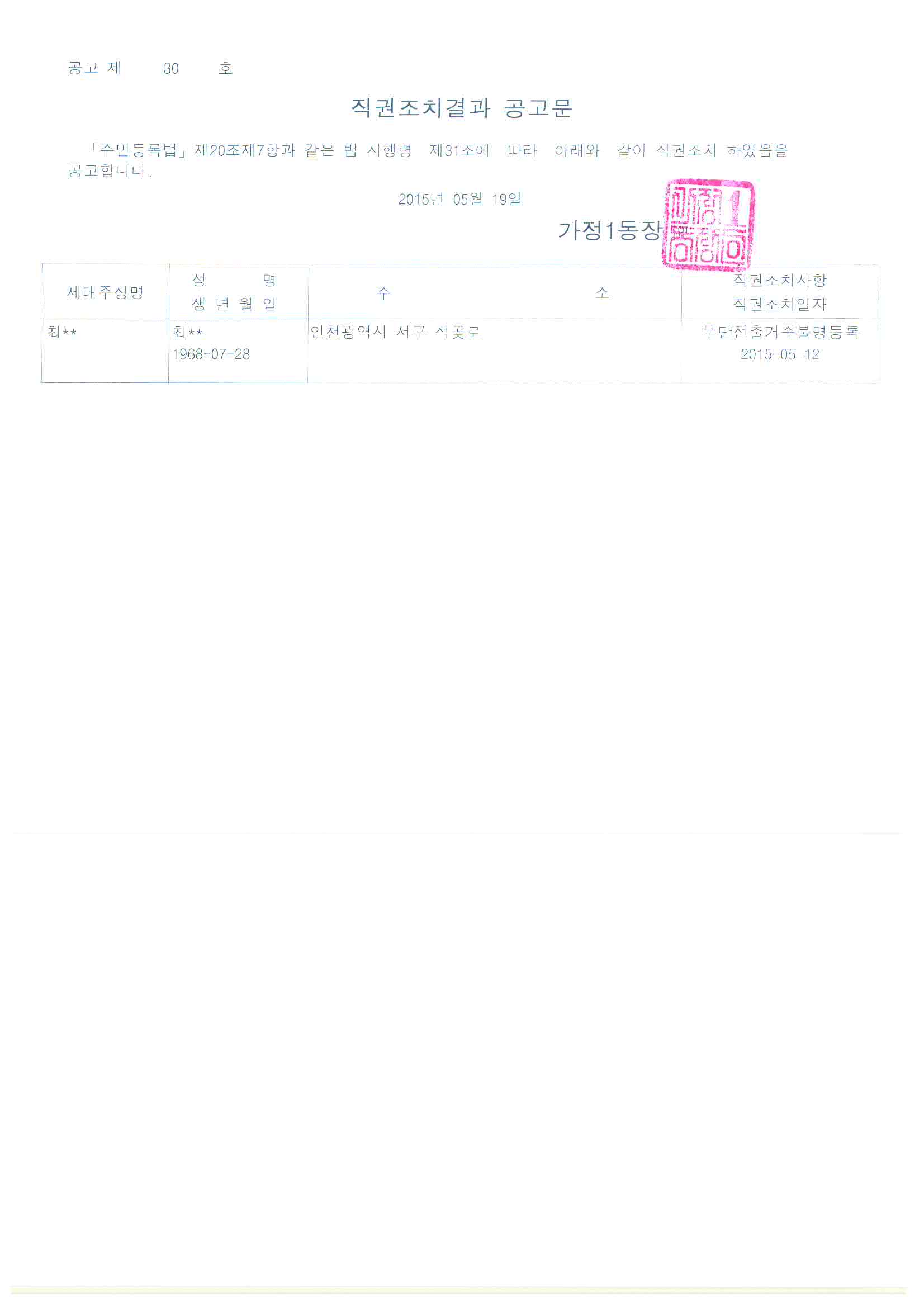 거주지 이전 신고 위반 무단전출자에 대하여 주민등록법 제20조 제7항 및 동법 시행령 제31조 규정에 의거 직권조치 사실을 통지하였으나 반송됨에 따라, 같은 법 시행령 제31조의 규정에 의거 홈페이지 및 게시판에 붙임과 같이 공고하고자 합니다.