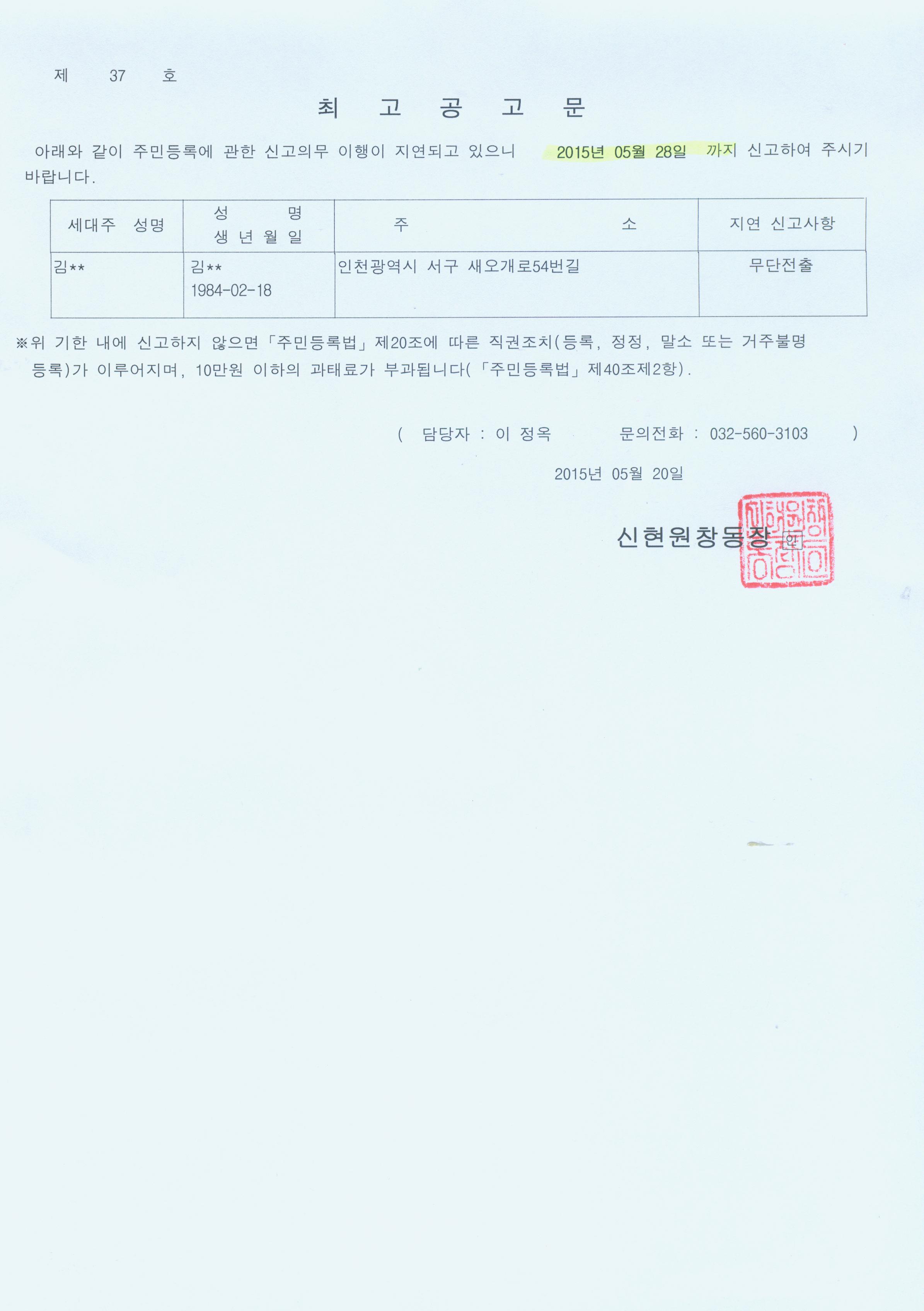 주민등록 무단전출로 판단되는 자에 대하여 최고장을 발송하였으나 기한 내 신고하지 않아 주민등록법 제20조 및 제3항, 동법 시행령 제28조에 의거하여 아래와 같이 공고(최고공고)합니다. |