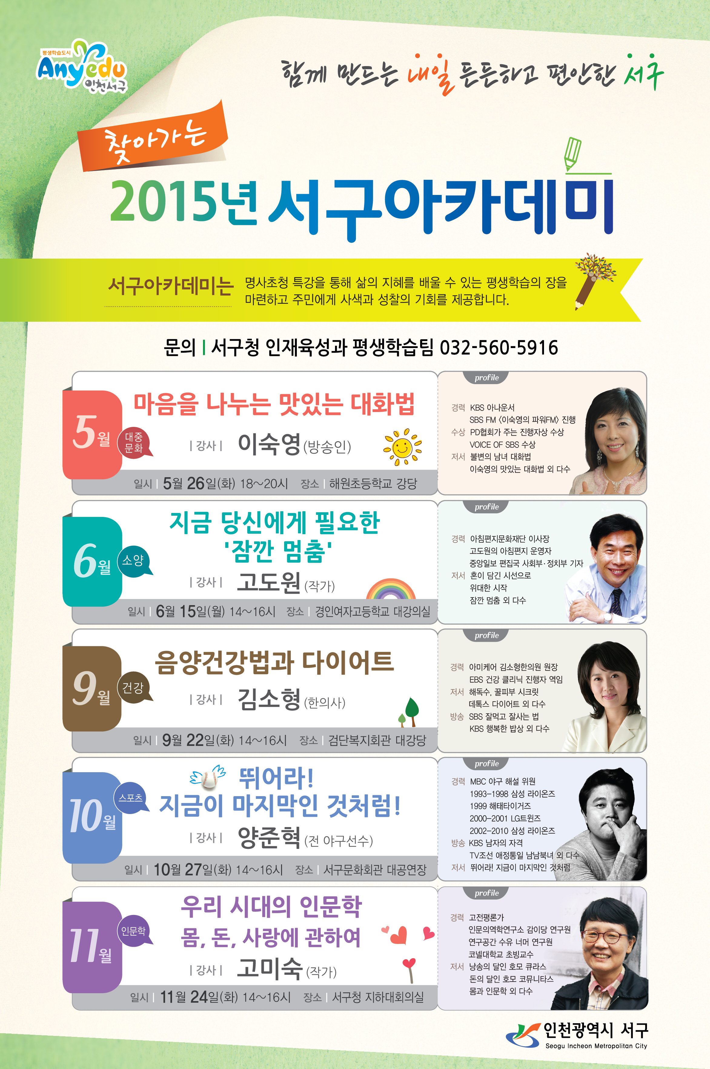 2. 이에 2015년도 명사초청 서구아카데미 일정을 알려드리오니 많은 주민들의 참여 바랍니다.