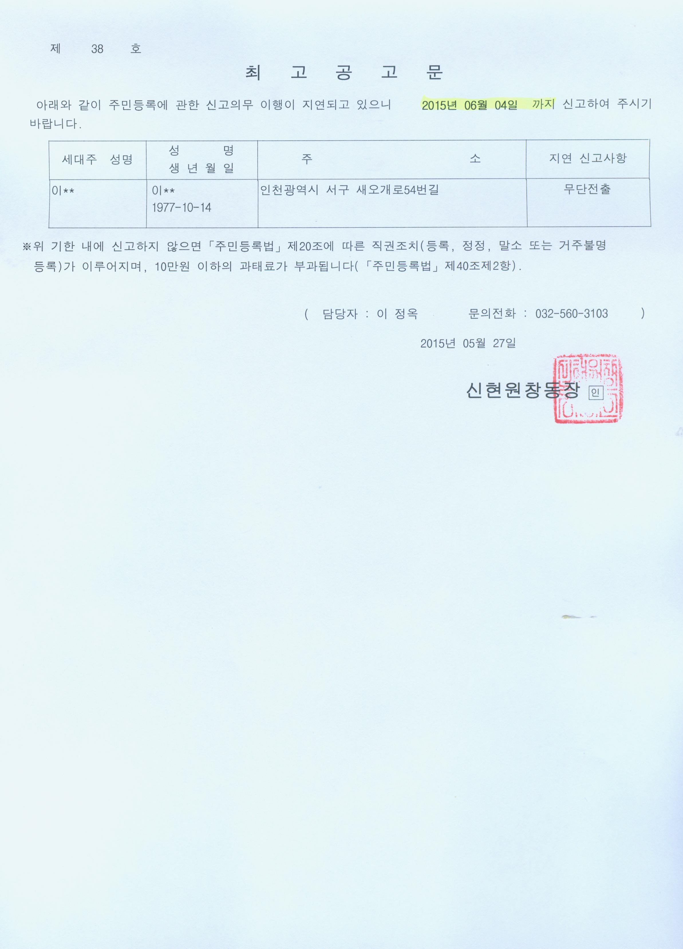 주민등록 무단전출로 판단되는 자에 대하여 최고장을 발송하였으나 기한 내 신고하지 않아 주민등록법 제20조 및 제3항, 동법 시행령 제28조에 의거하여 아래와 같이 공고(최고공고)합니다. |