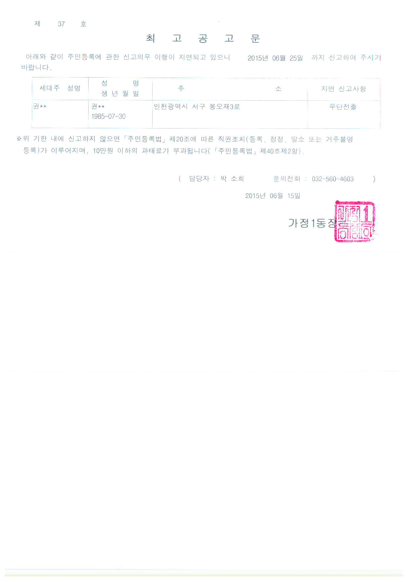주민등록 무단전출자에 대하여 최고통지 하였으나 현재까지 신고의무를 지연하고 있는 대상자에 대하여 주민등록법 제20조2제3항 및 동법시행령 제28조제2항에 따라 아래와 같이 최고공고 하고자 합니다.