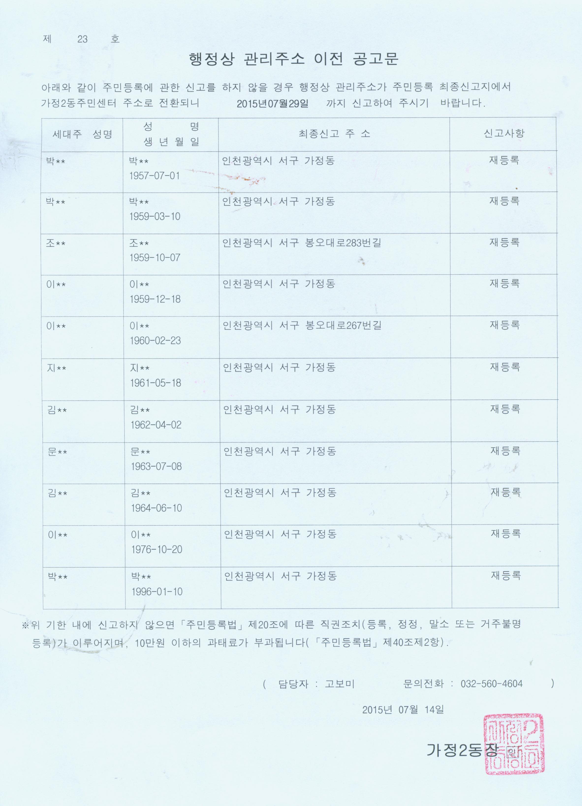 주민등록법 제20조제6항 및 부칙 제2조에 의거, 거주불명등록 후 1년이 경과한 거주불명등록자에 대하여 행정상 관리주소를 가정2동주민센터로 이전하기 위한 2차 공고를 실시하고자 합니다.