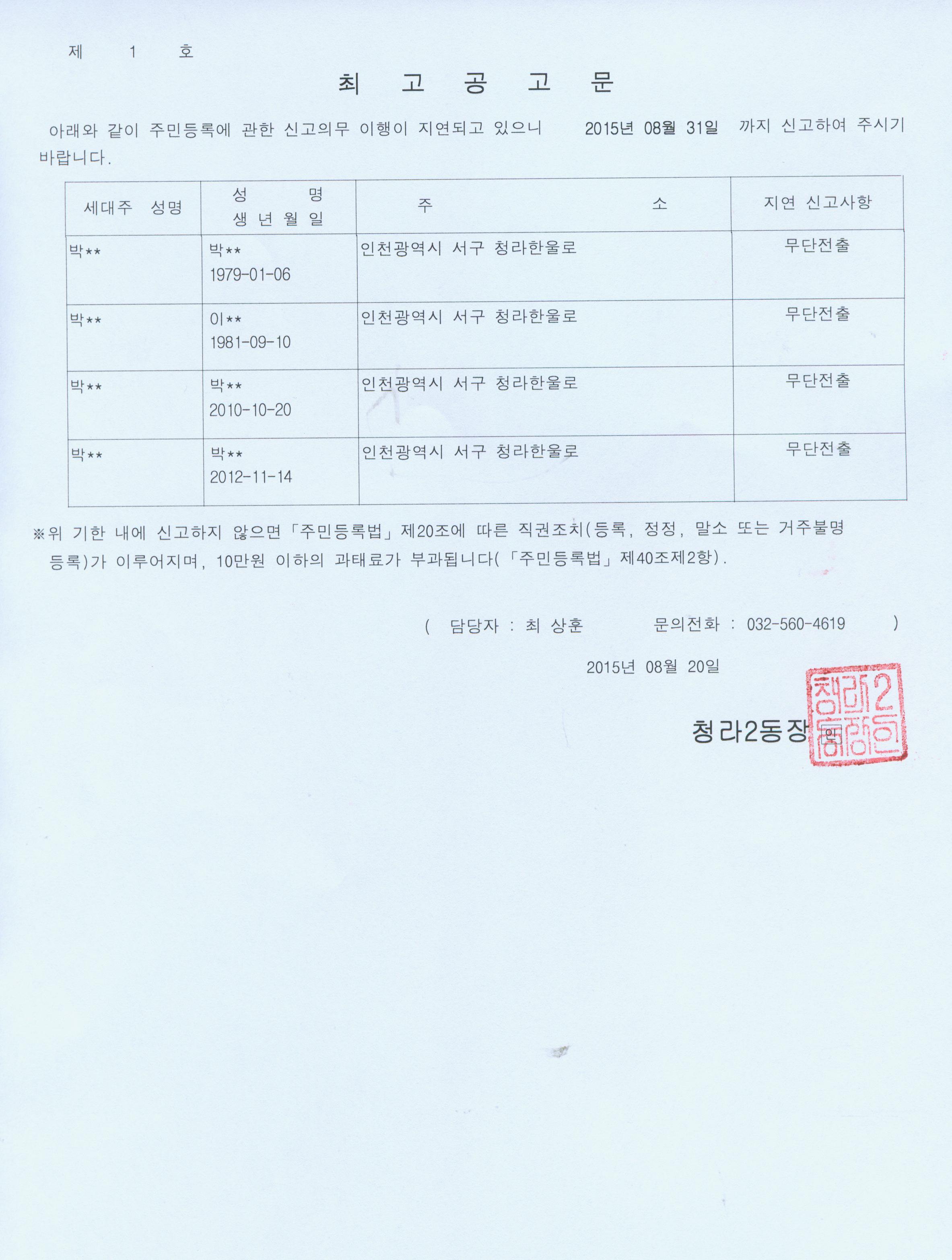 주민등록 무단전출자에 대해 주민등록법 제20조 및 동법 시행령 제28조 규정에 의거 아래와 같이 공고하고자 합니다.
