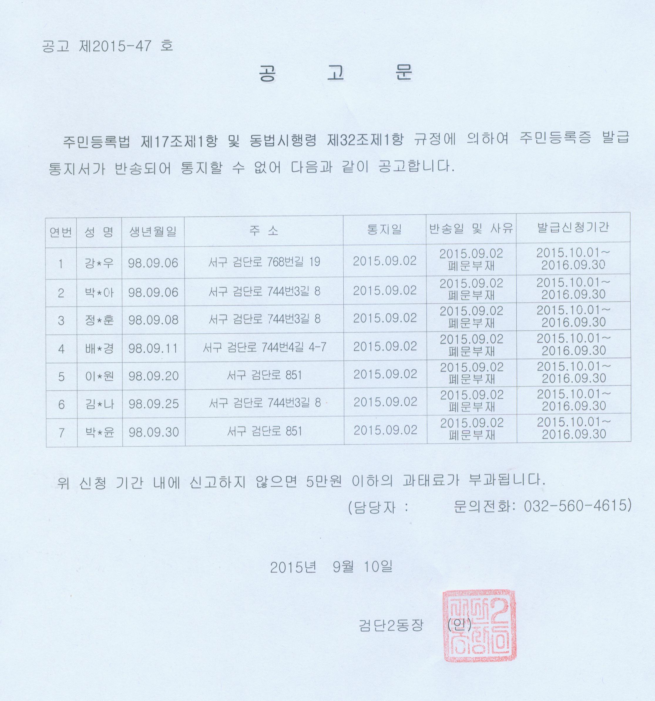 붙임 : 신규 주민등록증 발급통지 공고문(검단2동)1부. 끝.