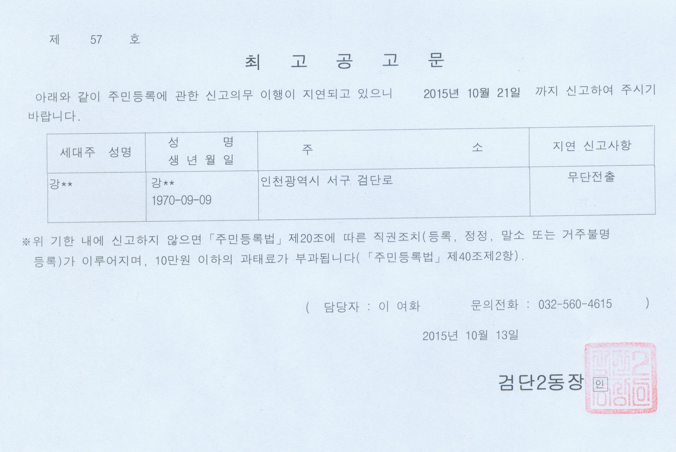주민등록 무단전출자에 대해 주민등록법 제20조 및 동법 시행령 제28조 규정에 의거 아래와 같이 공고하고자 합니다.