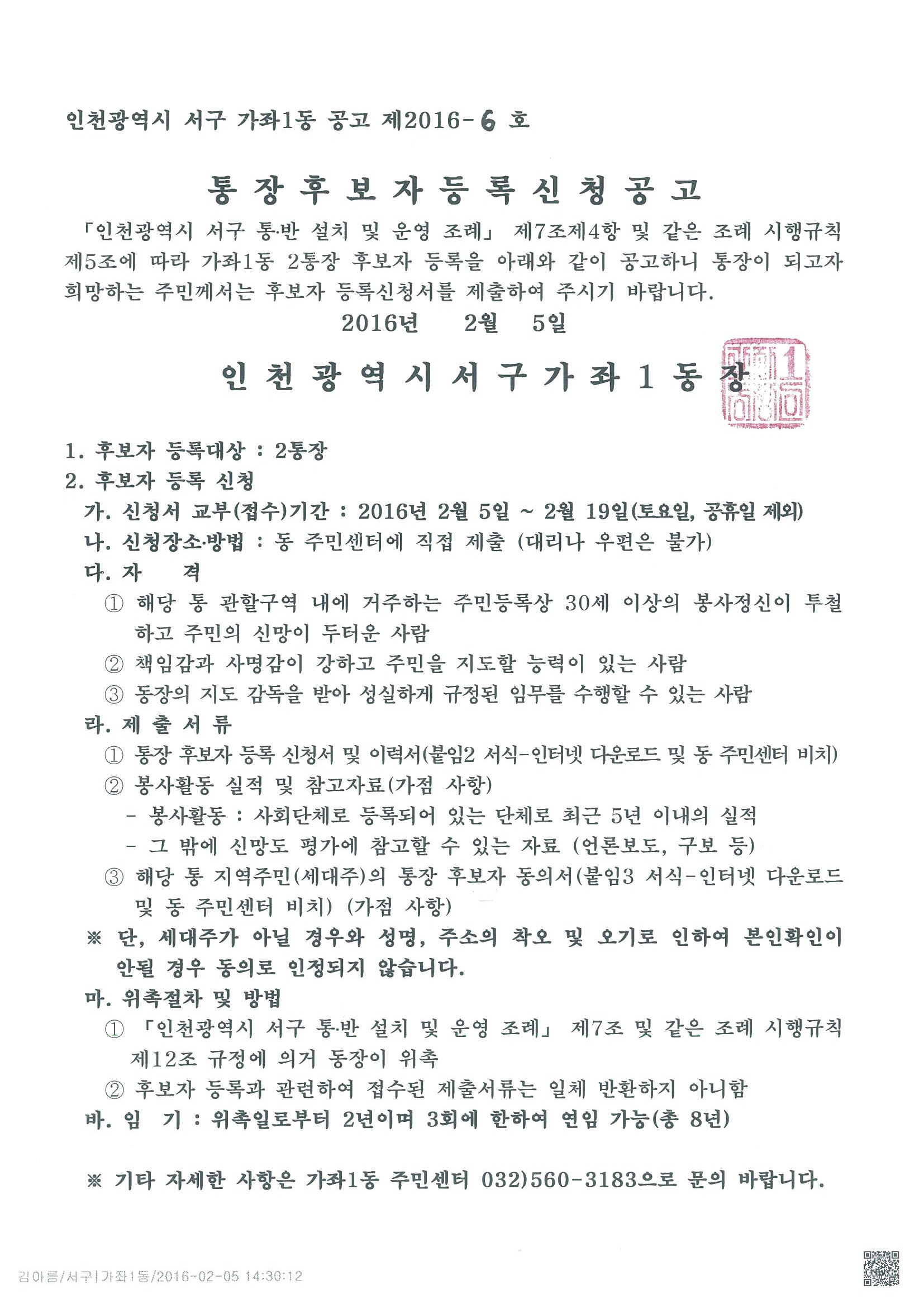 2016년 3월 임기가 만료되는 해당통의 통장을 투명하고 공정하게 선출하기 위한 통장 공개모집 공고문을 게시합니다.