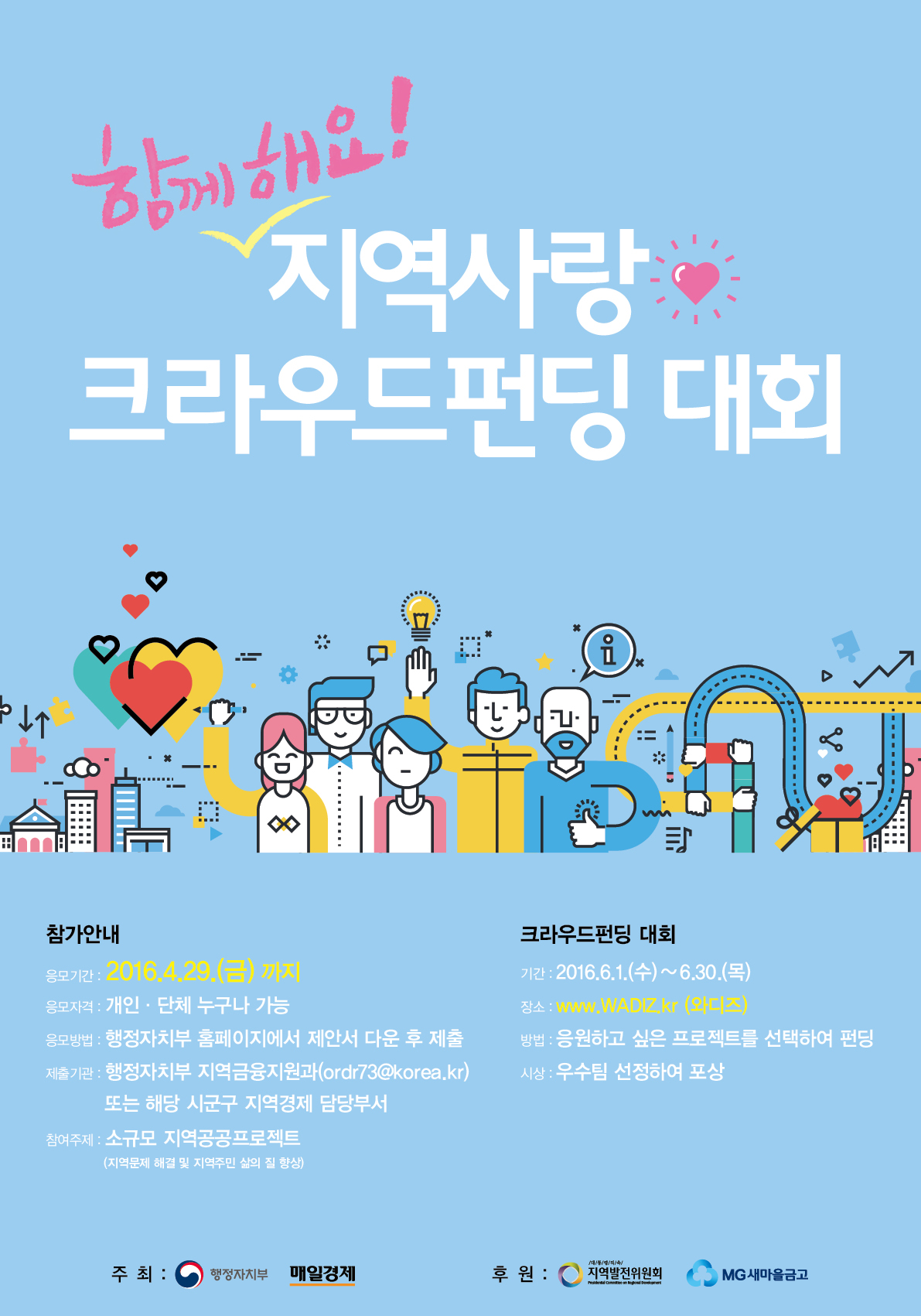 1. 행정자치부에서는 소셜네트워크 발전에 따라 새로운 자금조달방식으로 주목받고 있는 크라우드펀딩을 통해 지역경제 발전 및 공동체를 활성화하고, 소외계층을 지원하고자 『함께해요! 지역사랑 크라우드펀딩 대회』를 붙임과 같이 개최하오니 참고하시기 바랍니다.