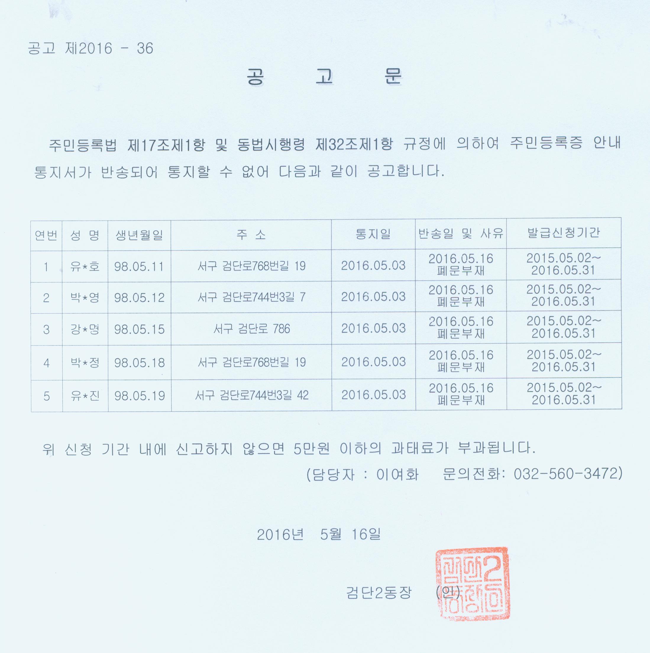 주민등록법제24조에 의거 주민등록증 신규 미발급자 안내 통지서를 등기를 통해 통지하였으나, 폐문부재 등의 이유로 반송되어 온 자에 대하여 아래와 같이 공고합니다.