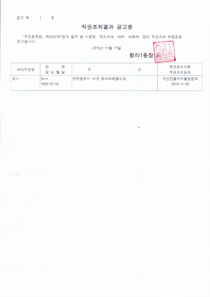 주민등록 무단전출자에 대하여 주민등록법 제20조제7항 및 동법시행령 제31조 규정에 의거 직권조치 하였음을 우편통지하였으나 폐문부재 등의 사유로 통지가 불가하여 아래와 같이 공고하고자 합니다.