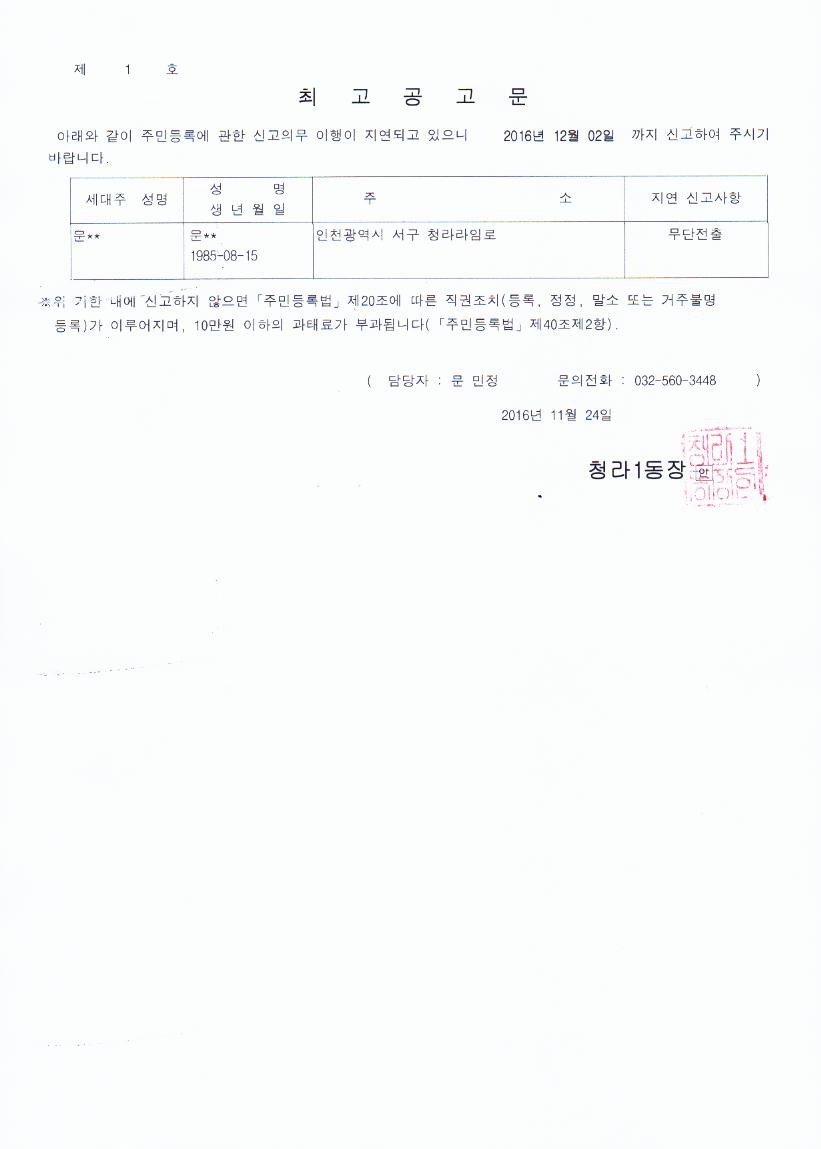 주민등록법 제20조 제3항의 규정에 의거 주민등록 무단전출자에 대하여 최고 하였으나, 수취인 부재 등의 사유로 반송되어 동법 시행령 제28조 규정에 의거 붙임과 같이 공고 하고자 합니다.