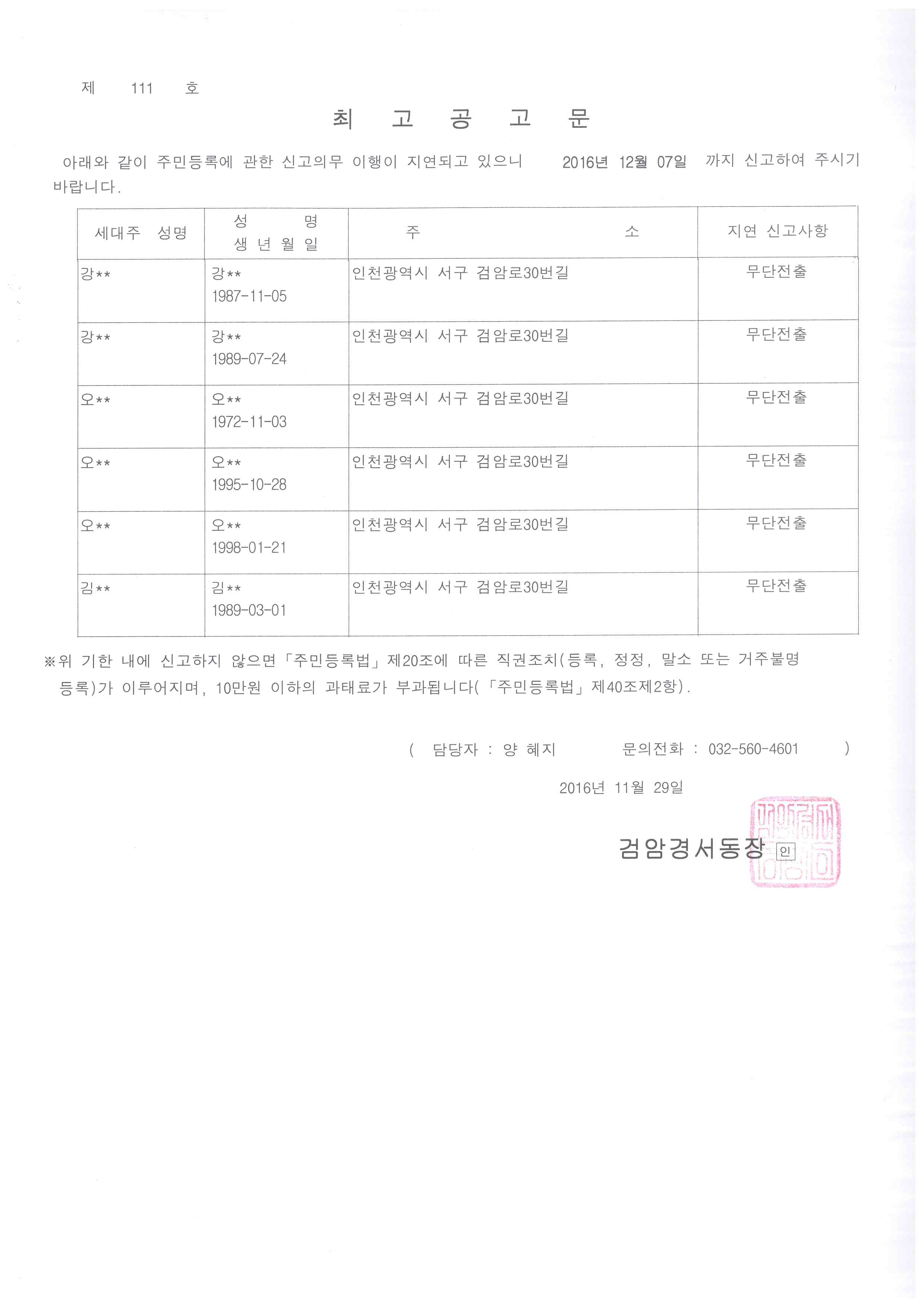 주민등록법 제20조의 3 및 동법 시행령 제28조의 규정에 의거 일정기간내에 신고하도록 최고하였으나, 최고장의 반송으로 아래와 같이 해당 무단전출자에 대하여 [홈페이지][게시판]에 최고공고하고자 합니다.