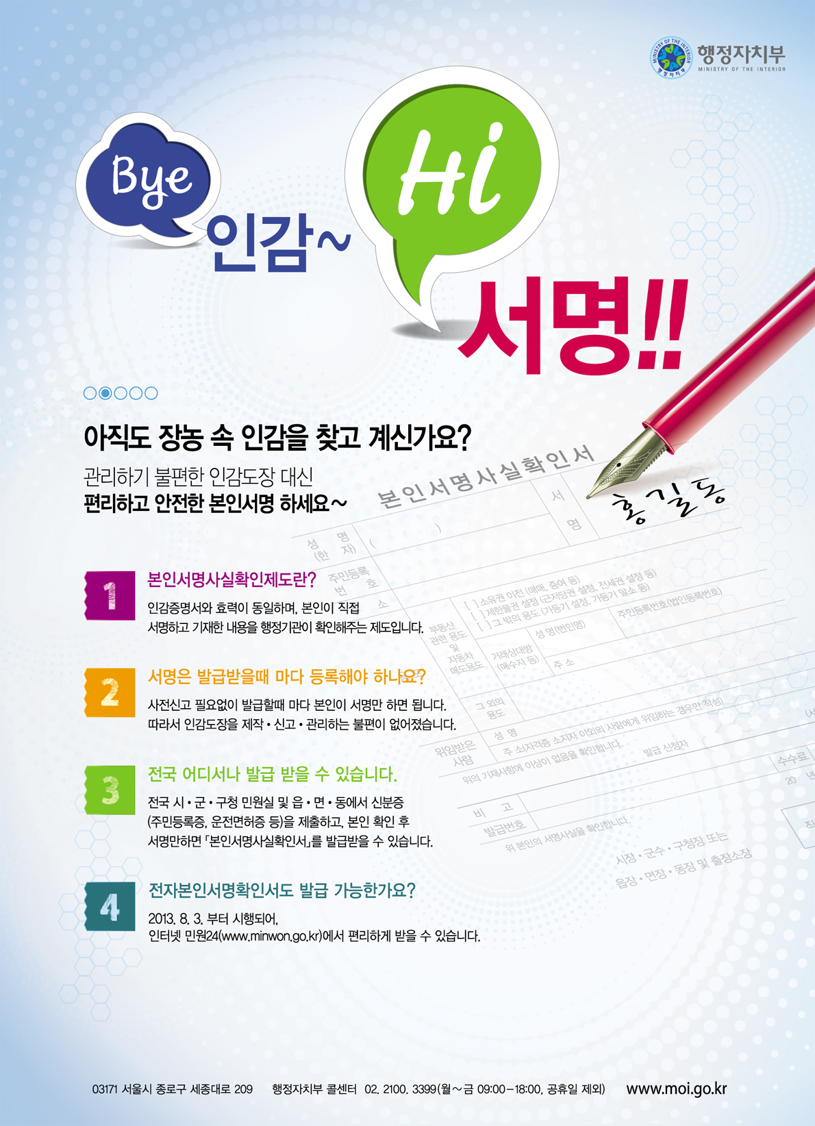 2. 사전등록 필요없이 발급할 때마다 본인이 서명만 하면 되고 전국 시·군·구청 민원실 및 읍·면·동 어디서나 신분증(주민등록증, 운전면허증 등) 제출하고 본인확인 후 『본인서명사실확인서』를 발급받을 수 있습니다.