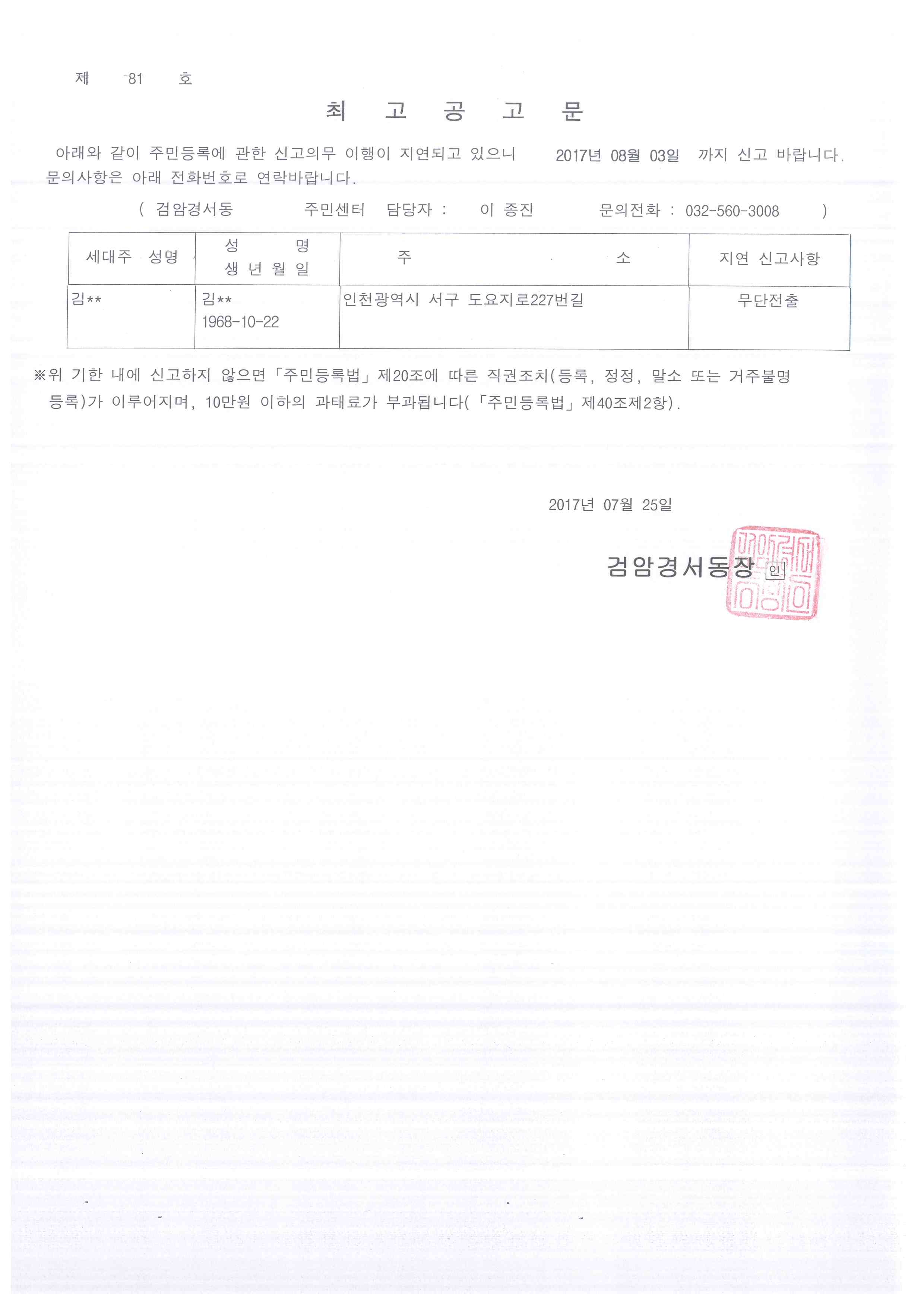 주민등록법 제20조의 3 및 동법 시행령 제28조의 규정에 의거 일정기간내에 신고하도록 최고하였으나, 최고장의 반송으로 아래와 같이 해당 무단전출자에 대하여 [홈페이지][게시판]에 최고공고하고자 합니다.