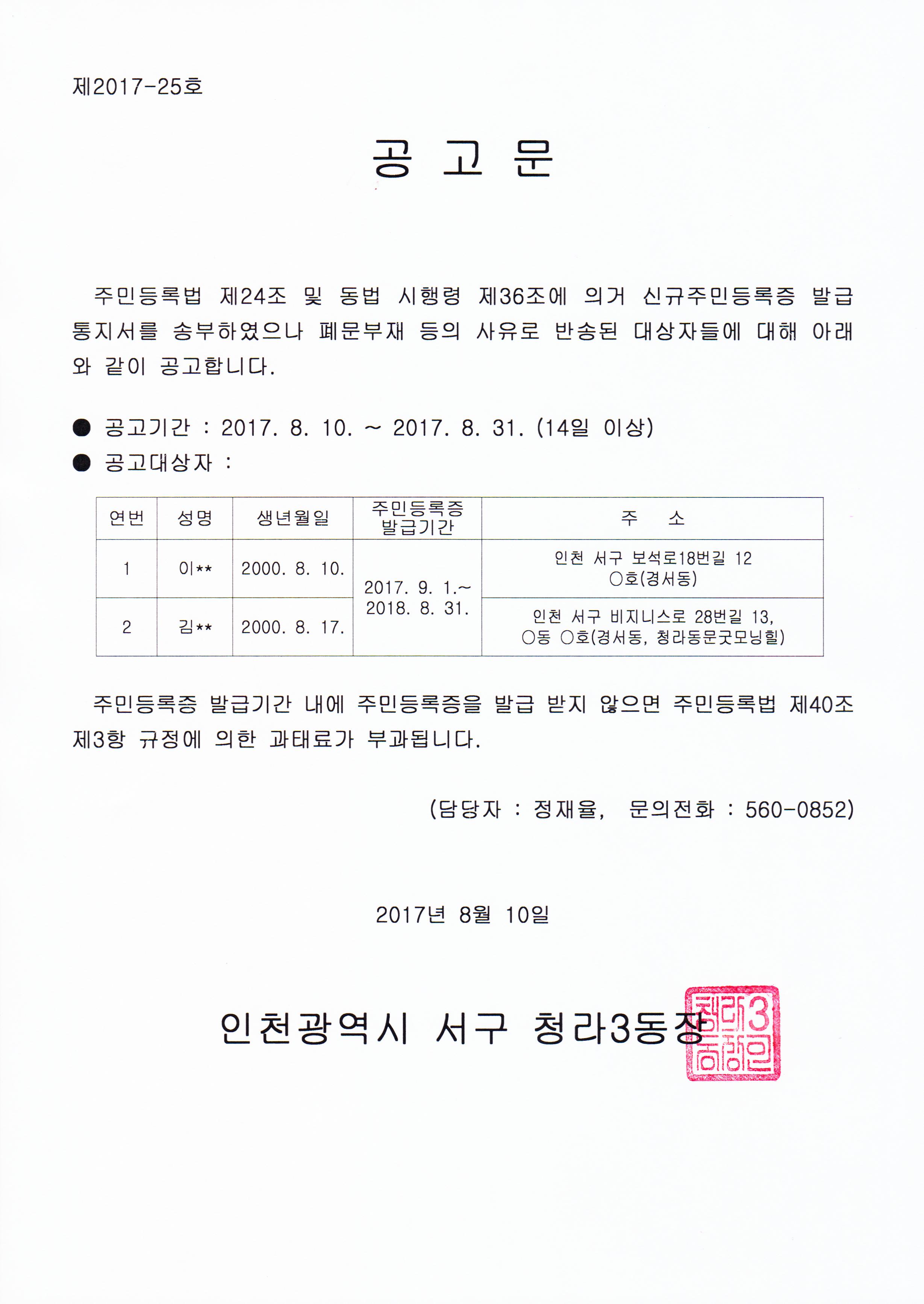 주민등록법 제24조 및 같은 법 시행령 제36조에 의거 신규주민등록증 발급통지서를 송부하였으나 폐문부재 등의 사유로 반송되어, 해당 대상자들에 대한 고시공고를 아래와 같이 홈페이지, 게시판에 게재하고자 합니다.