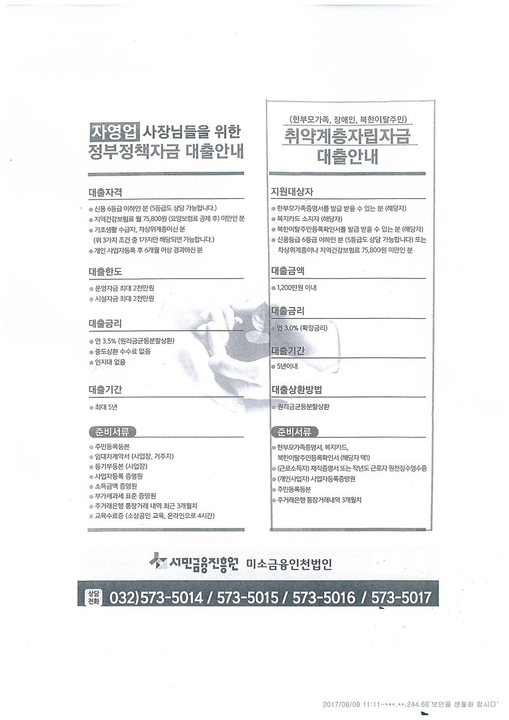 서민금융진흥원 미소금융인천법인에서 관내 거주하는 취약계층(한부모가족, 장애인, 북한이탈주민) 전용 대출을 아래와 같이 시행합니다.