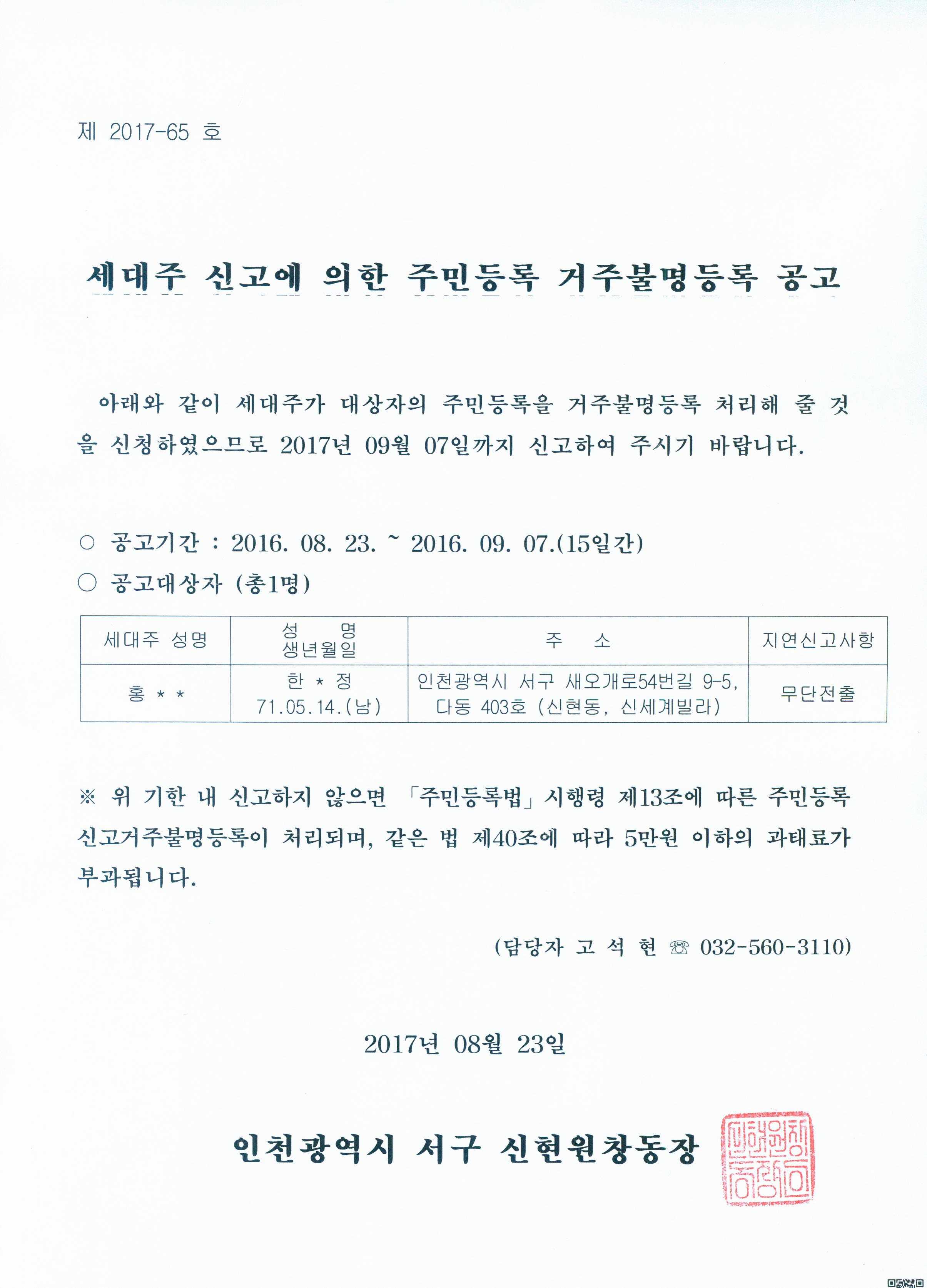 - 공고내용 : 세대원(동거인) 거주불명등록 신고