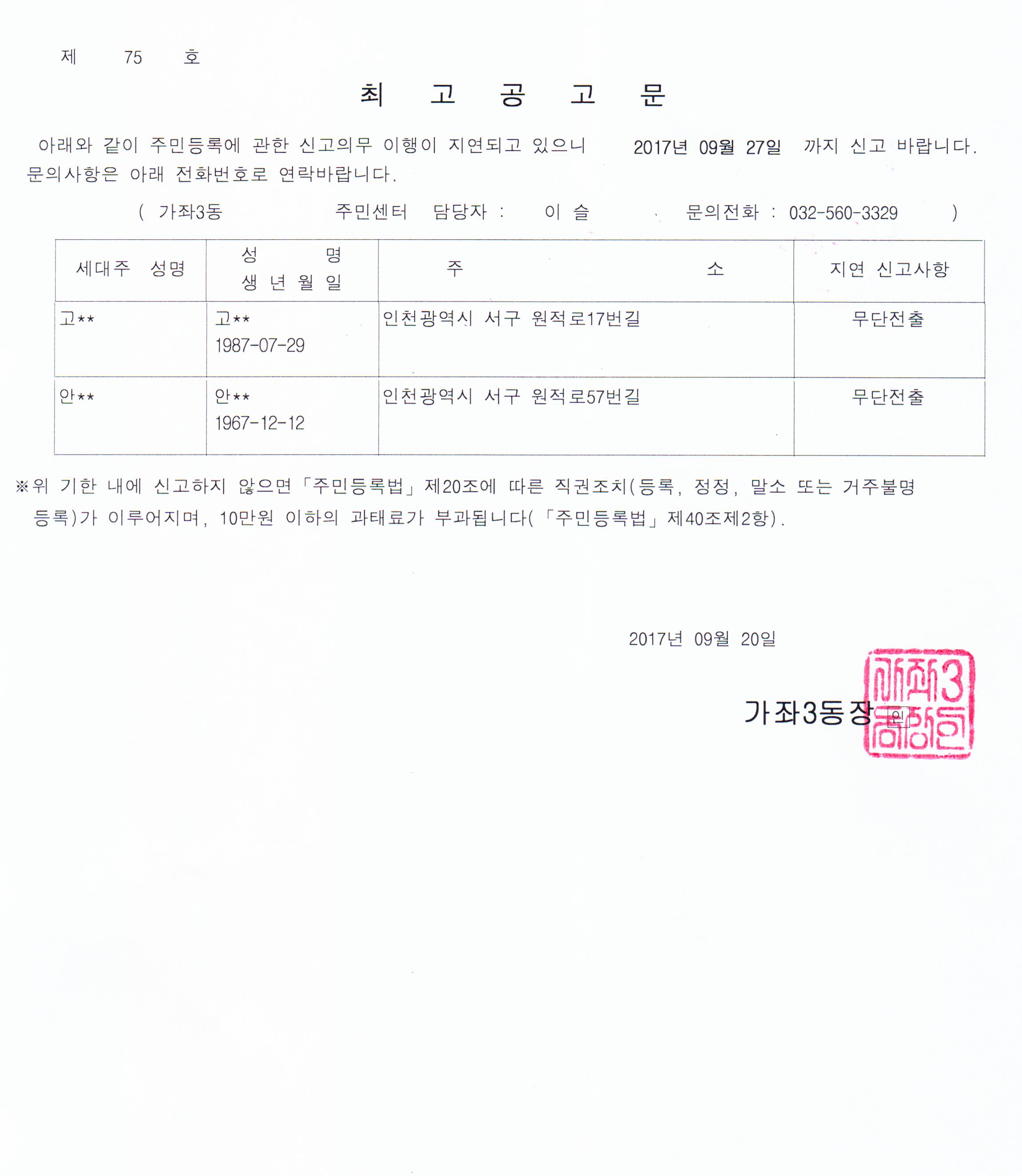 거주지 이동 후 기일 내에 주민등록 주소변경 신고 불이행 자에 대하여 최고장을 송부하였으나, 폐문부재의 사유로 반송되어 주민등록법 제20조 및 동법 시행령 제28조 규정에 의거 최고대상자를 아래와 같이 공고하고자 합니다.