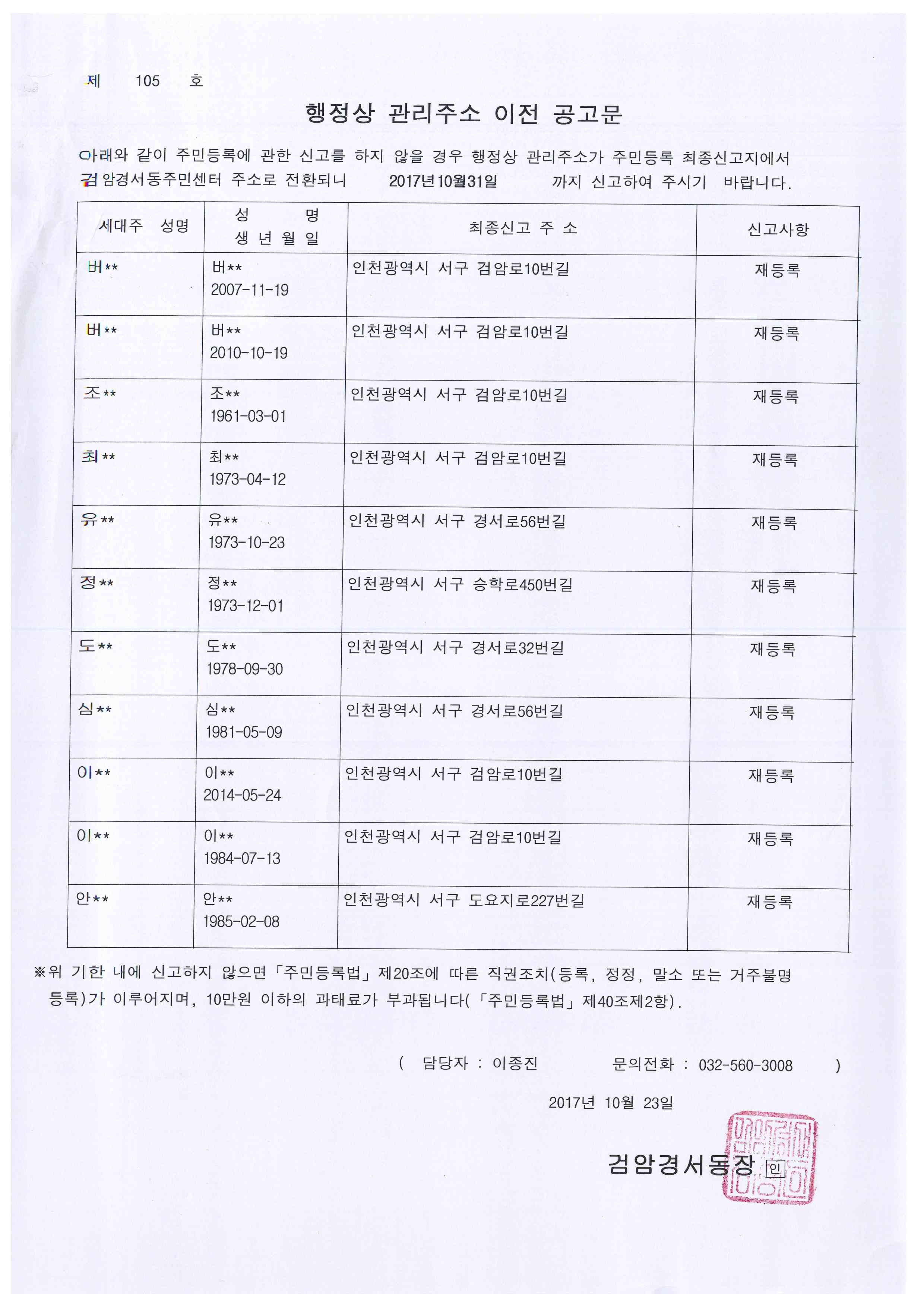 「주민등록법」 제20조 제6항 및 부칙 제2조에 의거, 거주불명등록 후 1년이 경과한 거주불명등록자에 대하여 아래와 같이 행정상 관리주소를 검암경서동행정복지센터로 이전하기 위하여 1차 공고하고자 합니다.