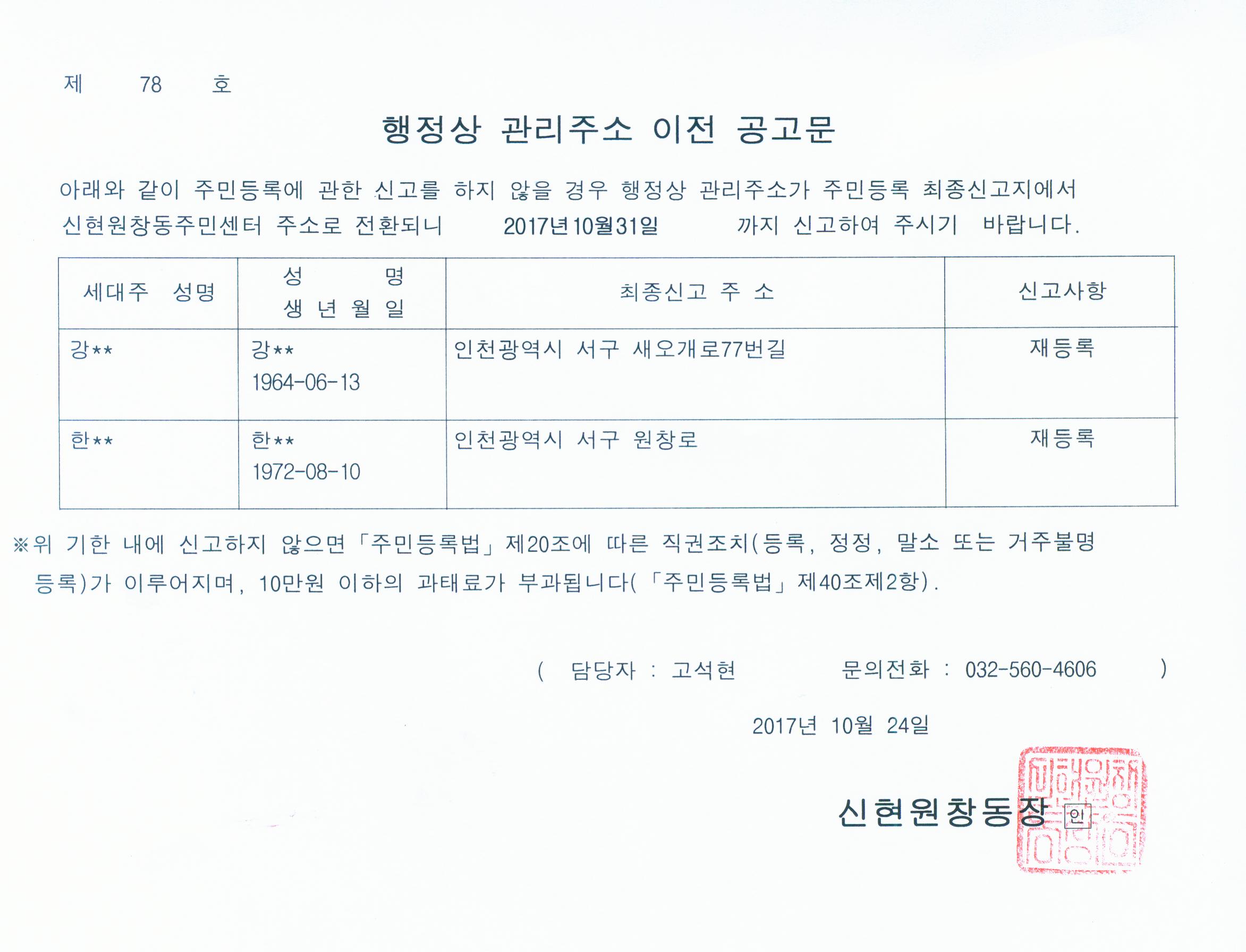 「주민등록법 제20조제6항 및 부칙 제2조에 의거, 거주불명등록 후 1년이 경과한 거주불명등록자에 대하여 행정상 관리주소를 신현원창동 주민센터로 이전하기 위한 1차 공고를 실시하고자 합니다.」