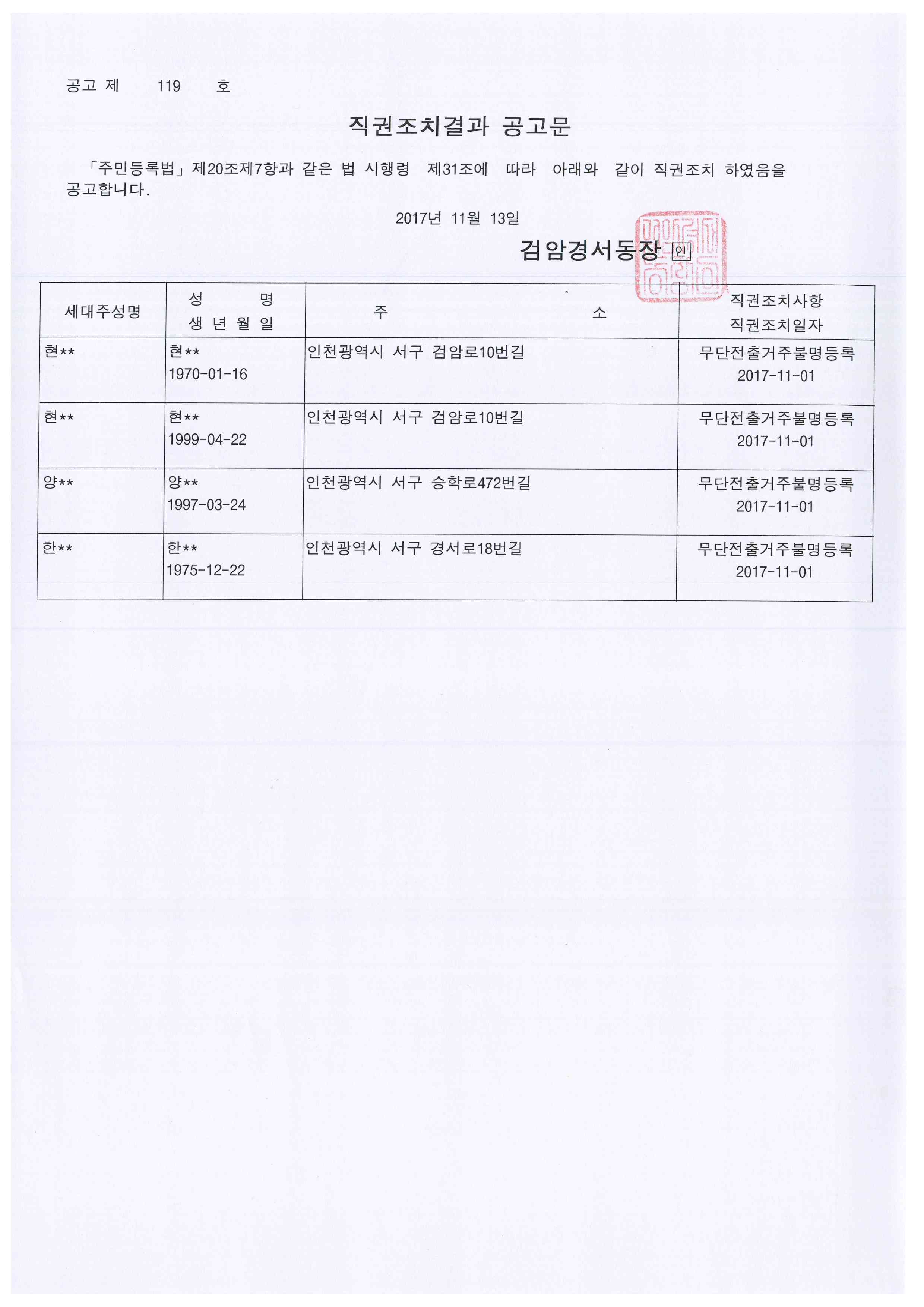 거주지 이전신고 위반 무단전출자에 대하여 주민등록법 제20조제6항 및 동법시행령 제31조의 규정에 의거 직권조치 사실을 통지하였으나 반송됨에 따라, 같은법 시행령 제31조의 규정에 의거 홈페이지 및 게시판에 아래와 같이 공고하고자 합니다.