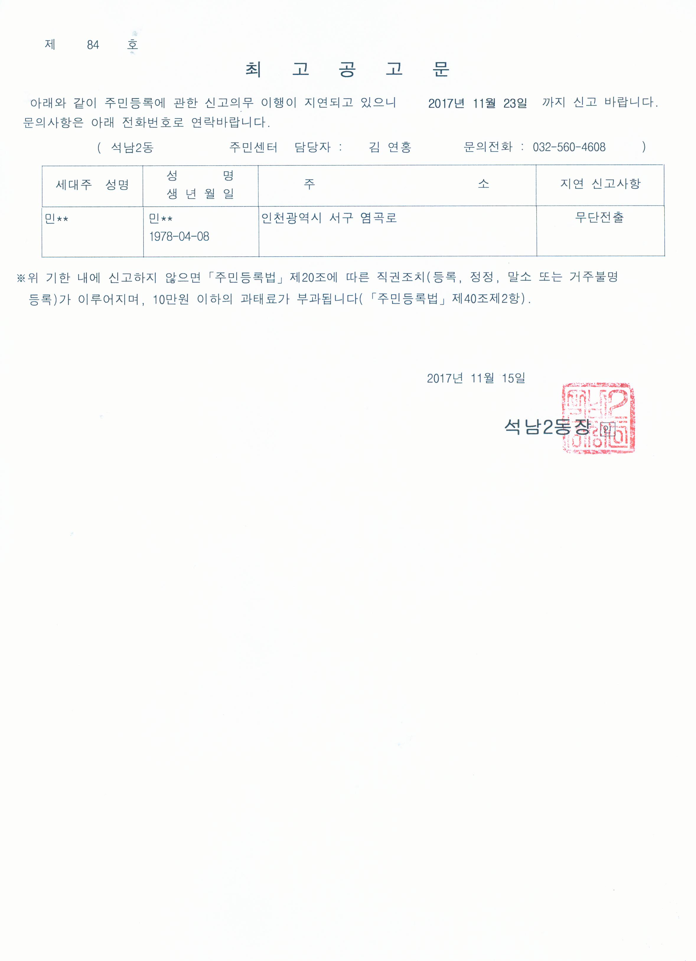 주민등록 무단전출자에 대해 주민등록법 제20조 및 같은 법 시행령 제28조의 규정에 의거 기간 내에 신고하도록 최고를 하였으나, 최고장의 반송으로 해당 무단전출자에 대한 최고공고문을 아래와 같이 [홈페이지] 및 [게시판]에 공고하고자합니다.