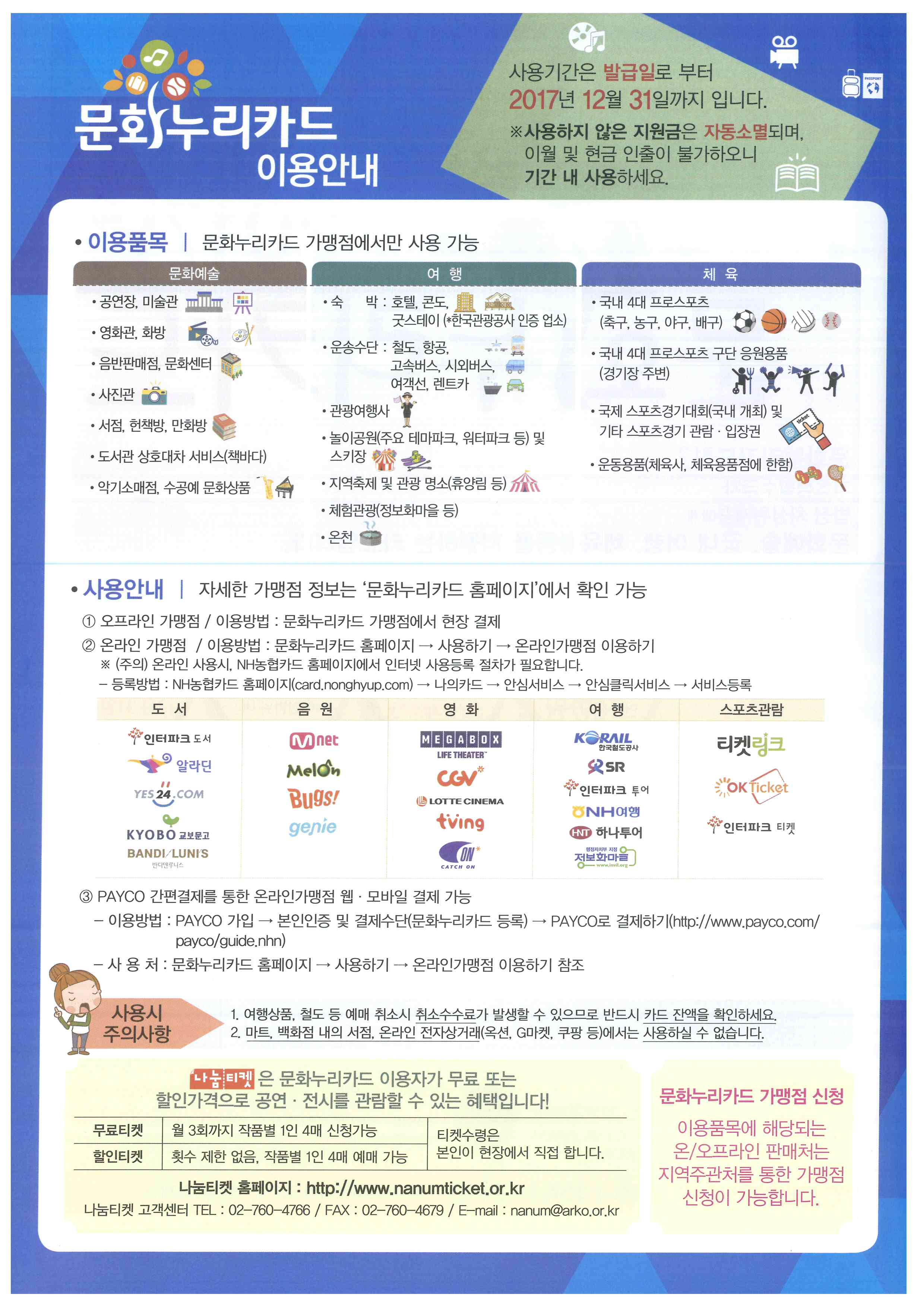 2017년문화누리카드 이용권자 중 아직까지 발급(재충전)받지 않으신 분들께서는 서둘러 발급받으시고