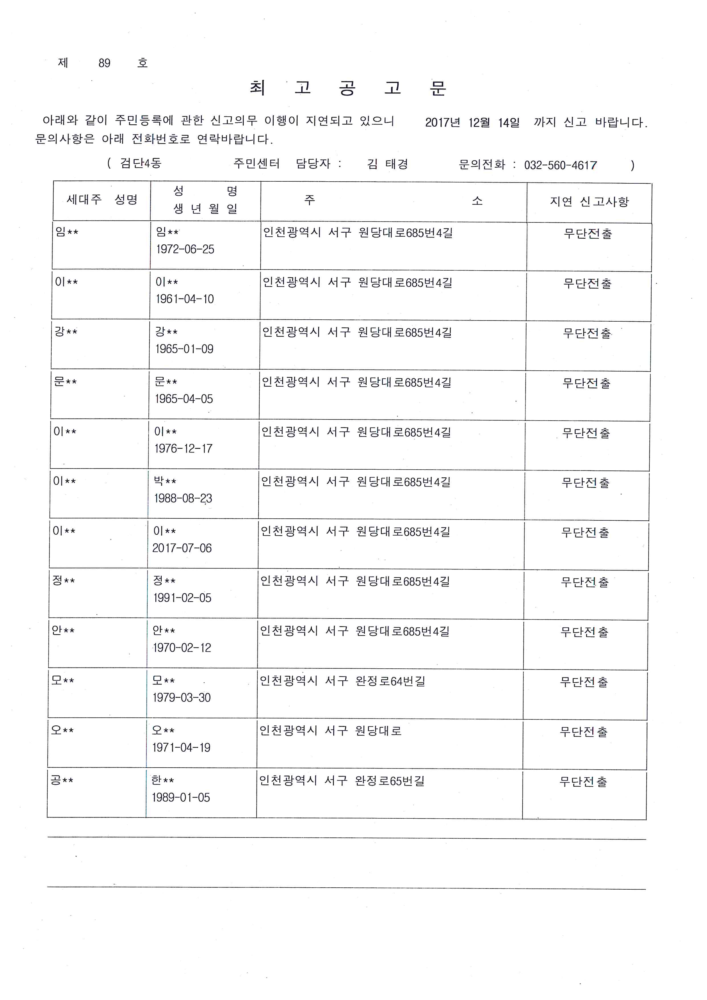 주민등록 무단전출자로 확인된 세대에 대하여 주민등록법 제20조제3항의 규정에 따라 일정기간 내에 신고하도록 최고하였으나 최고장이 반송됨에 따라 아래와 같이 최고 공고합니다.
