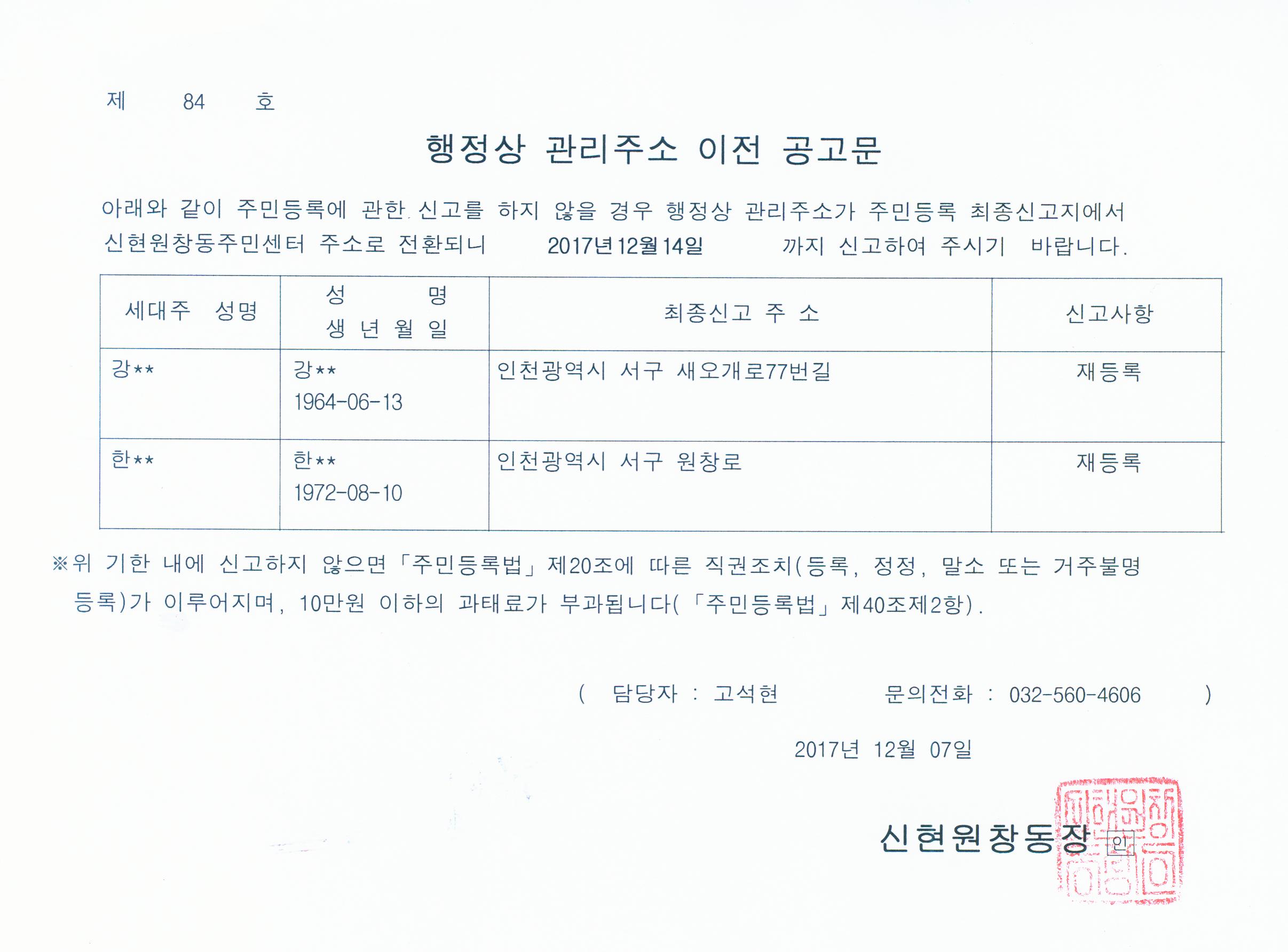 「주민등록법 제20조제6항 및 부칙 제2조에 의거, 거주불명등록 후 1년이 경과한 거주불명등록자에 대하여 행정상 관리주소를 신현원창동 주민센터로 이전하기 위한 2차 공고를 실시하고자 합니다.」