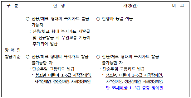 □ 개정 내용 : 장애인 단순무임교통카드 발급대상 확대