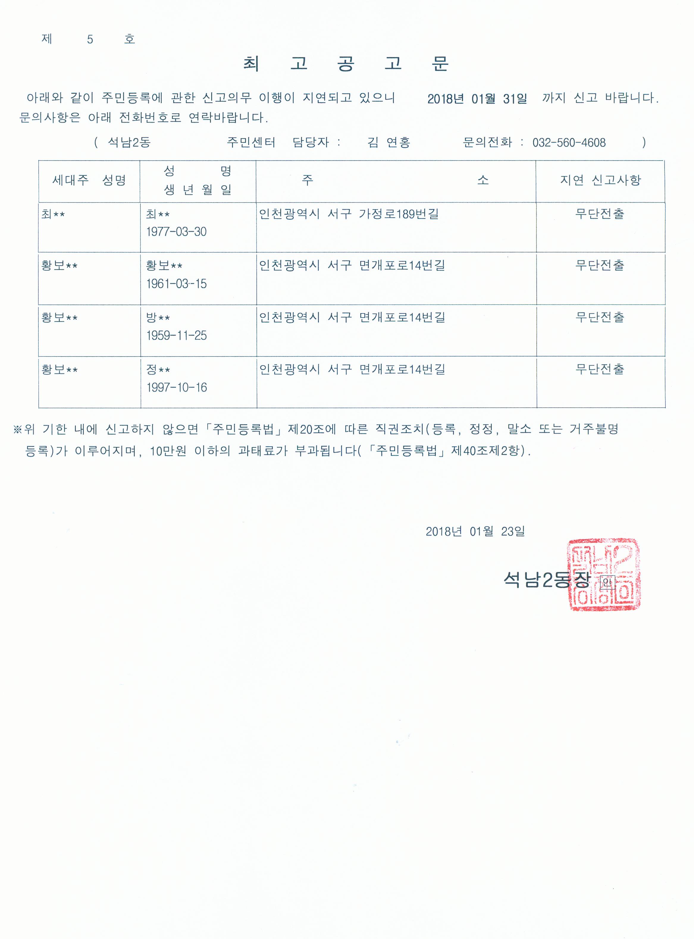 주민등록 무단전출자에 대해 주민등록법 제20조 및 같은 법 시행령 제28조의 규정에 의거 기간 내에 신고하도록 최고를 하였으나, 최고장의 반송으로 해당 무단전출자에 대한 최고공고문을 아래와 같이 [홈페이지] 및 [게시판]에 공고하고자합니다.