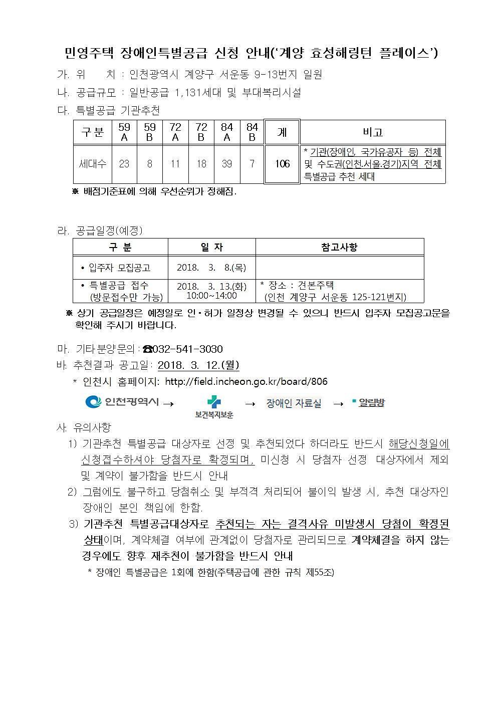 민영주택 장애인특별공급 신청 안내(‘계양 효성해링턴 플레이스’)