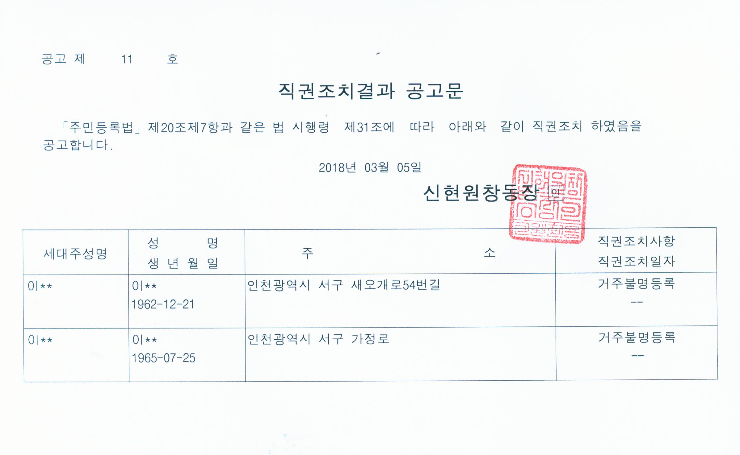 「주민등록법 제20조 제6항에 의거 거주불명등록 후 1년이 경과한 거주불명등록자에 대하여 제1차 및 제2차 이전 공고 후 행정상 관리주소를 신현원창동 주민센터(인천 서구 가정로335번길 3, 신현동)로 직권거주불명등록이전 조치하였음을 공고합니다.