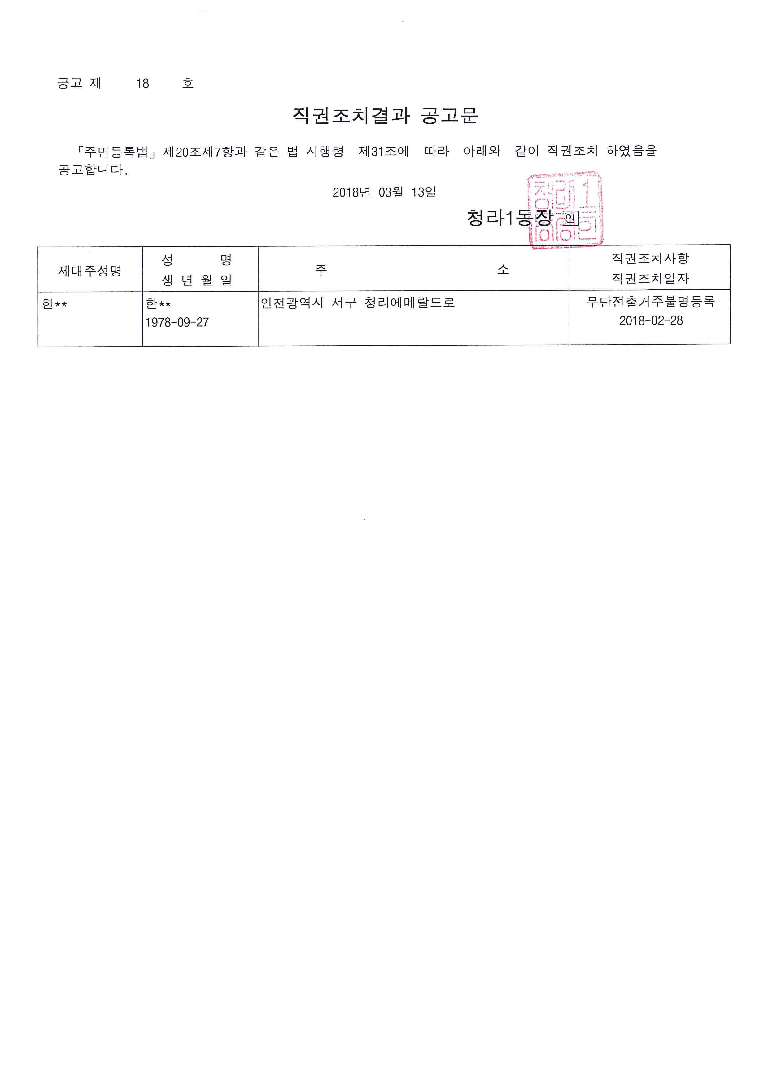 주민등록 무단전출자에 대하여 주민등록법 제20조 제7항 및 동법시행령 제31조 규정에 의거 직권조치 하였음을 우편통지 하였으나 폐문부재 등의 사유로 통지가 불가하여 아래와 같이 공고하고자 합니다.