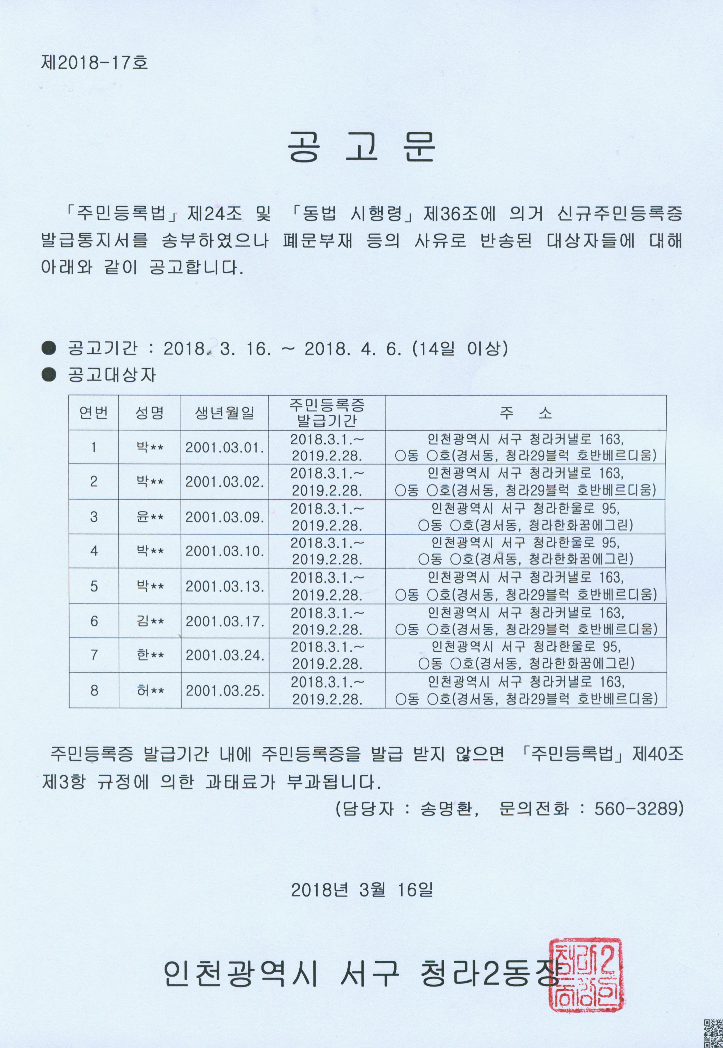 ● 공고대상 : 박**, 박**, 윤**, 박**, 박**, 김**, 한**, 허** (청라2동)