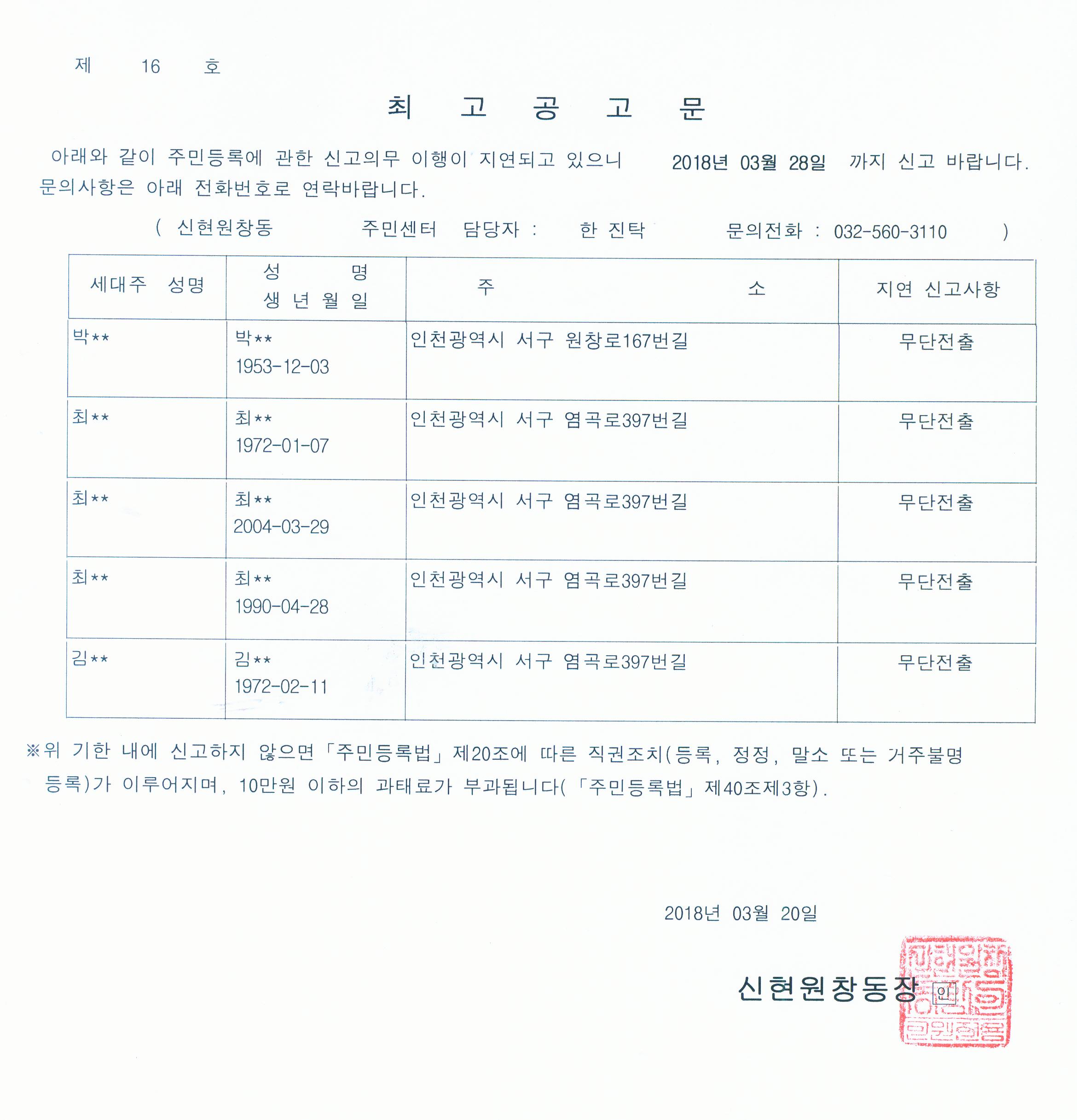 「주민등록 무단전출로 판단되는 자에 대하여 최고장을 발송하였으나 수취인불명 등의 사유로 최고장이 반송되어 주민등록법 제20조 제3항 및 동법 시행령 제28조에 의거하여 아래와 같이 공고(최고공고)합니다.」