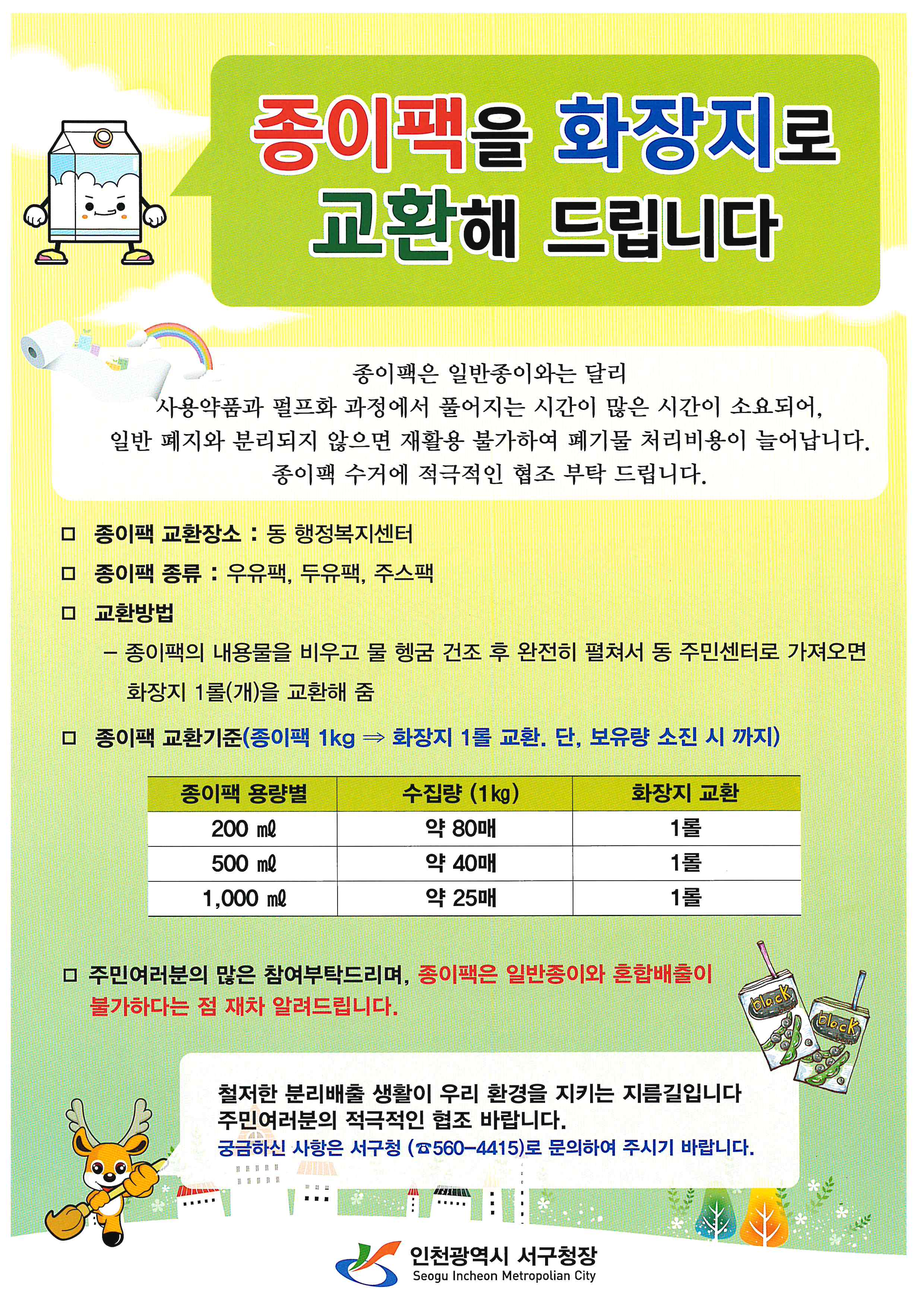 종이팩을 화장지로 교환해 드립니다 !