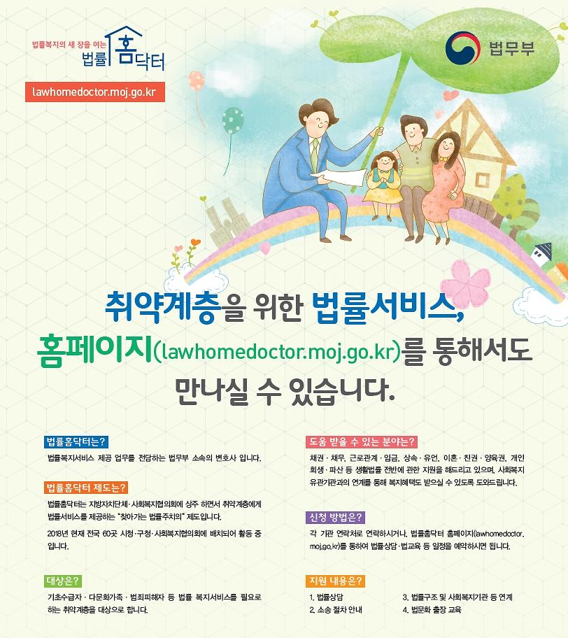 취약계층을 대상으로 법무부 소속의 변호사가 상주하여 법률서비스를 제공하는 '찾아가는 법률주치의' 제도로 18년 현재 전국 60곳에서 활동 중에 있으며, 사회복지 유관기관의 연계를 통해 복지혜택까지 연결하는 법률복지서비스입니다.