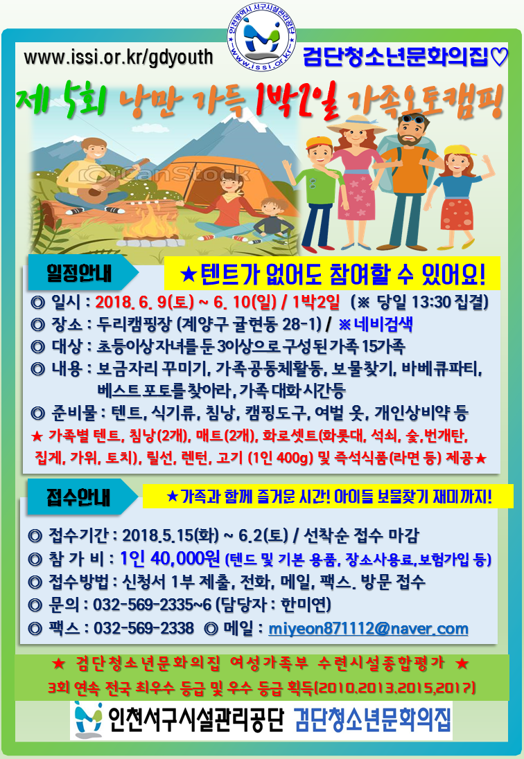2018 검단청소년문화의집 제5회 낭만가득 1박2일 가족오토캠핑 안내