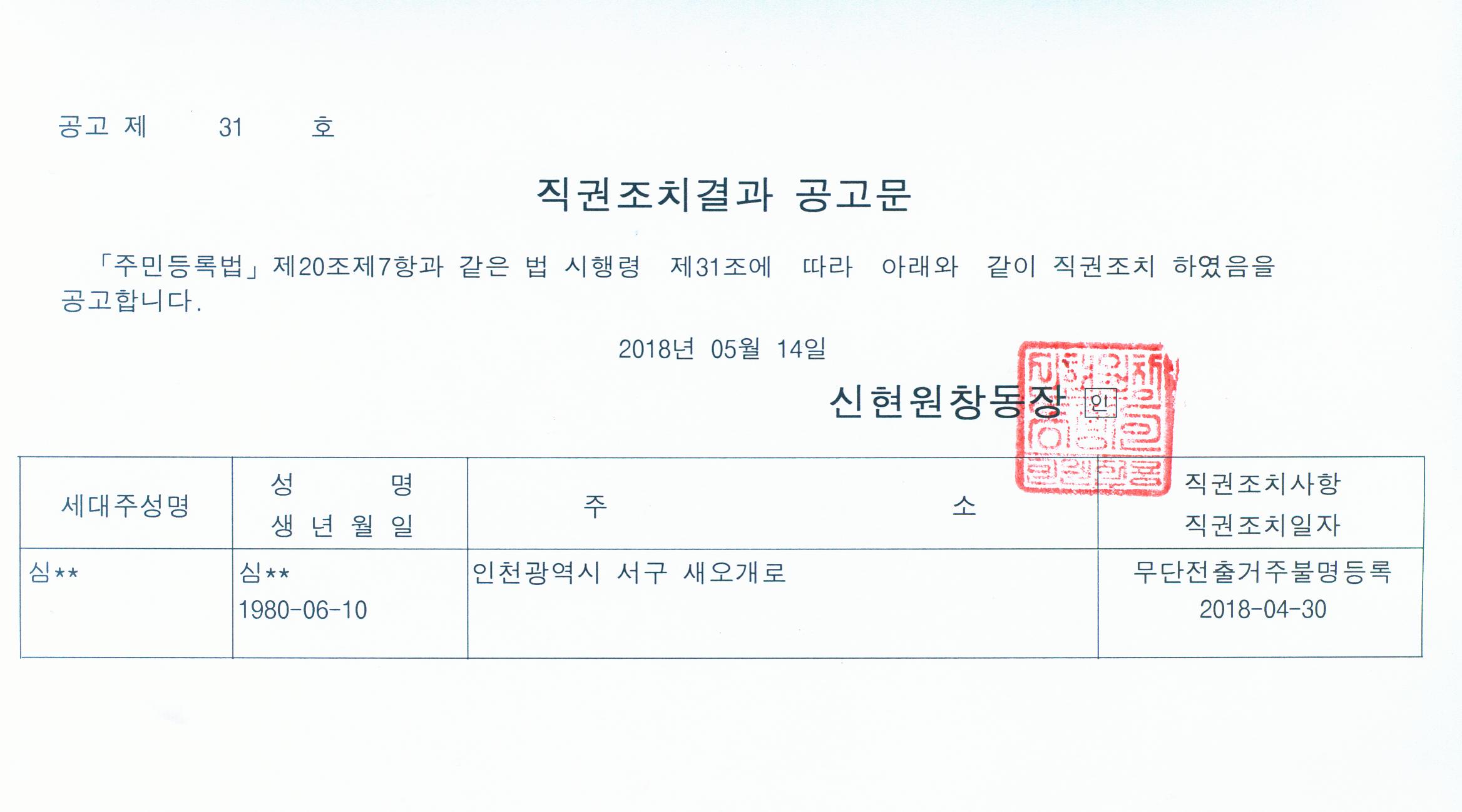 「주민등록 무단전출자에 대한 직권조치결과(거주불명등록) 통지서가 수취인불명의 사유로 도달하지 않고 반송되어 주민등록법 제20조 및 같은 법 시행령 제31조에 따라 직권조치결과를 공고합니다. 직권조치결과에 이의가 있을 때에는 주민등록법 제21조 제1항에 따라 공고된 날부터 30일 이내에 이의신청을 할 수 있습니다.