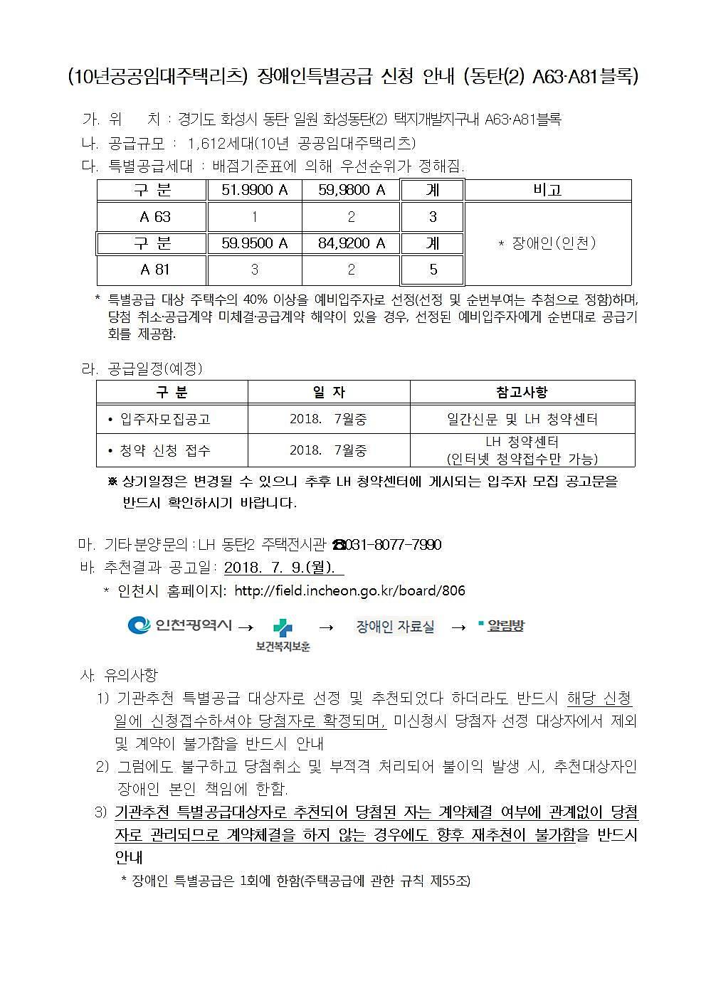 (10년공공임대주택리츠) 장애인특별공급 신청 안내(동탄(2)A63·A81블록)