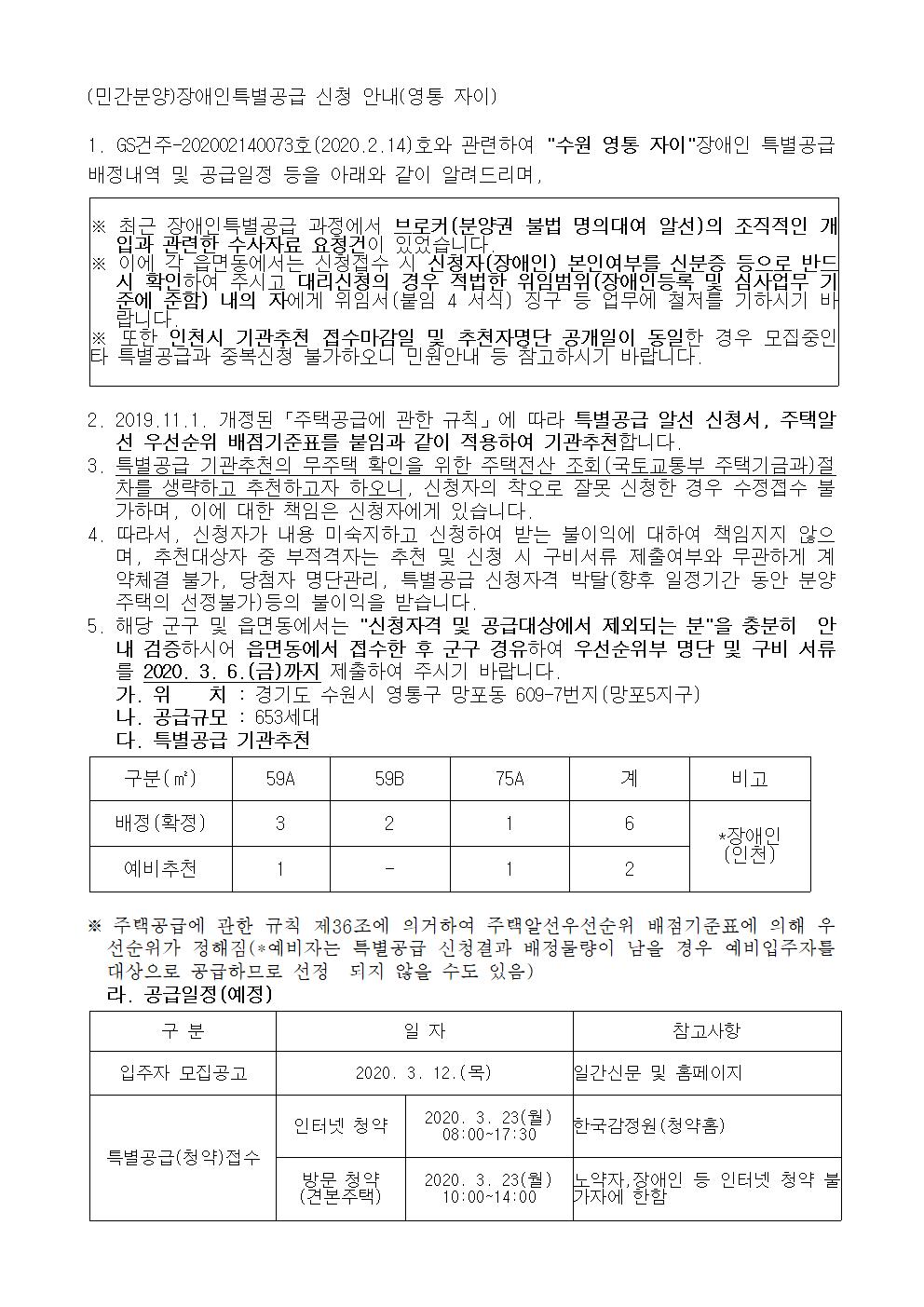 (민간분양)장애인특별공급 신청 안내 (영통 자이)