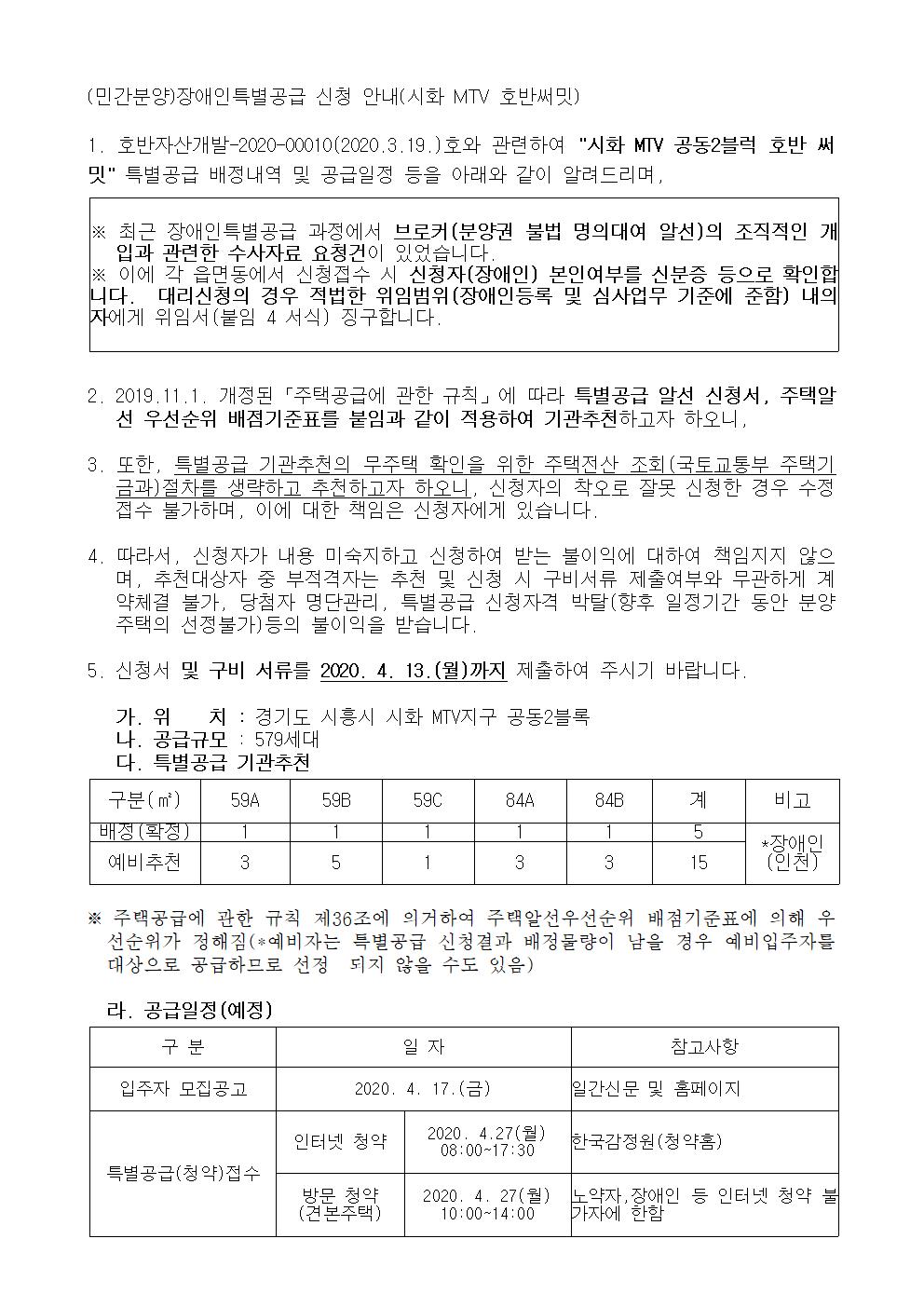 (민간분양)장애인특별공급 신청 안내(시화 MTV 호반써밋)