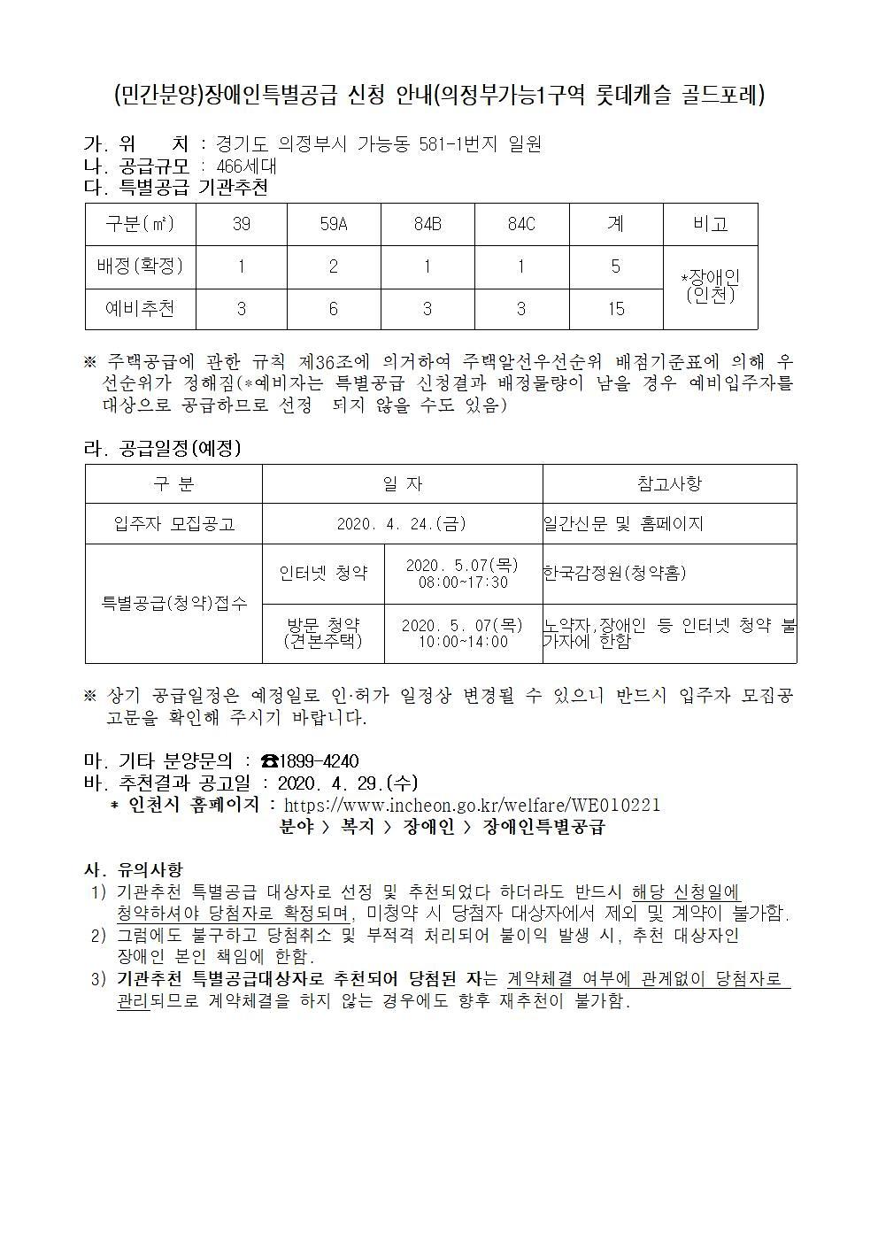 (민간분양)장애인특별공급 신청 안내(의정부가능1구역 롯데캐슬 골드포레)
