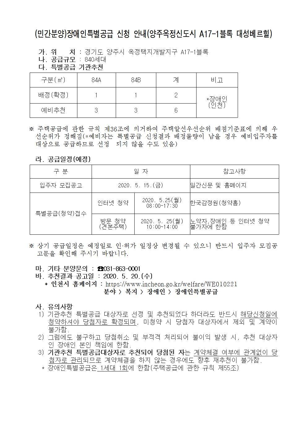 (민간분양)장애인특별공급 신청 안내(양주옥정신도시 A17-1블록 대성베르힐)