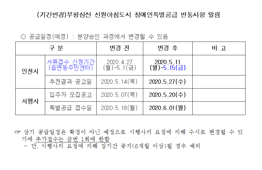 (기간변경)부평삼산 신원아침도시 장애인특별공급 변동사항 알림
