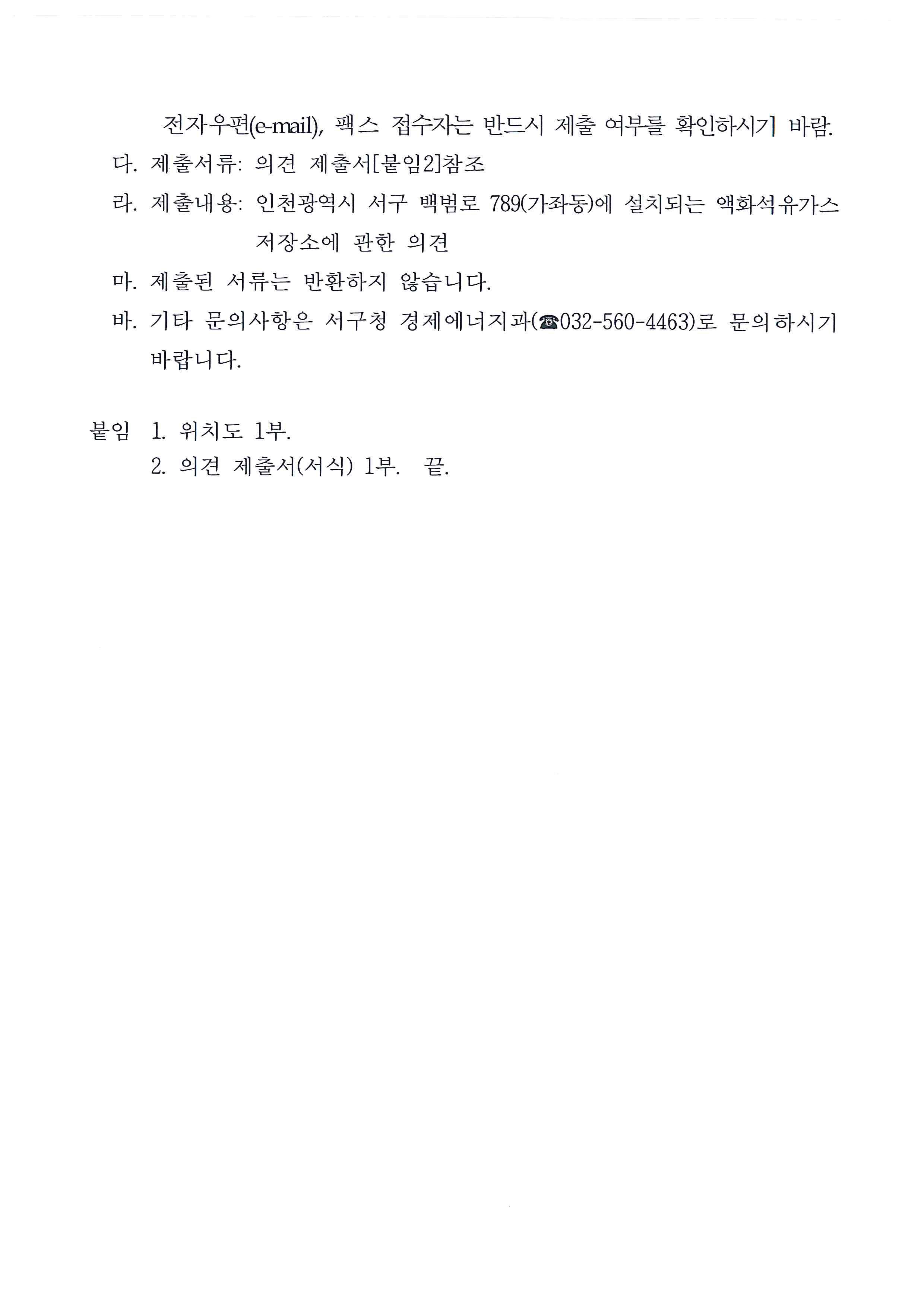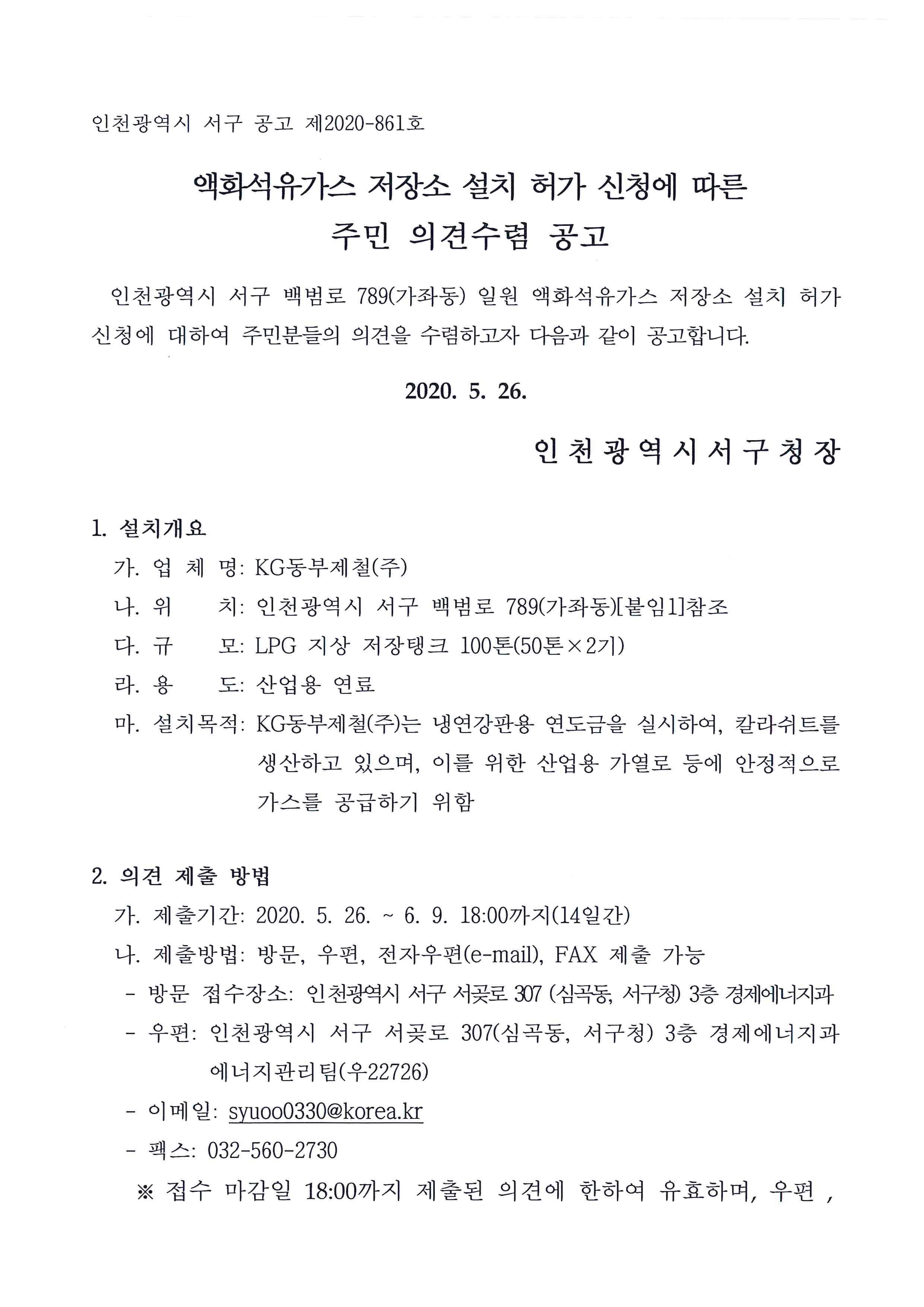액화석유가스 저장소 설치 허가 신청에 따른 주민 의견수렴 공고