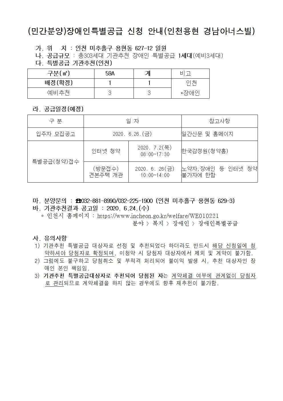 (민간분양)장애인특별공급 신청 안내(인천용현 경남아너스빌)